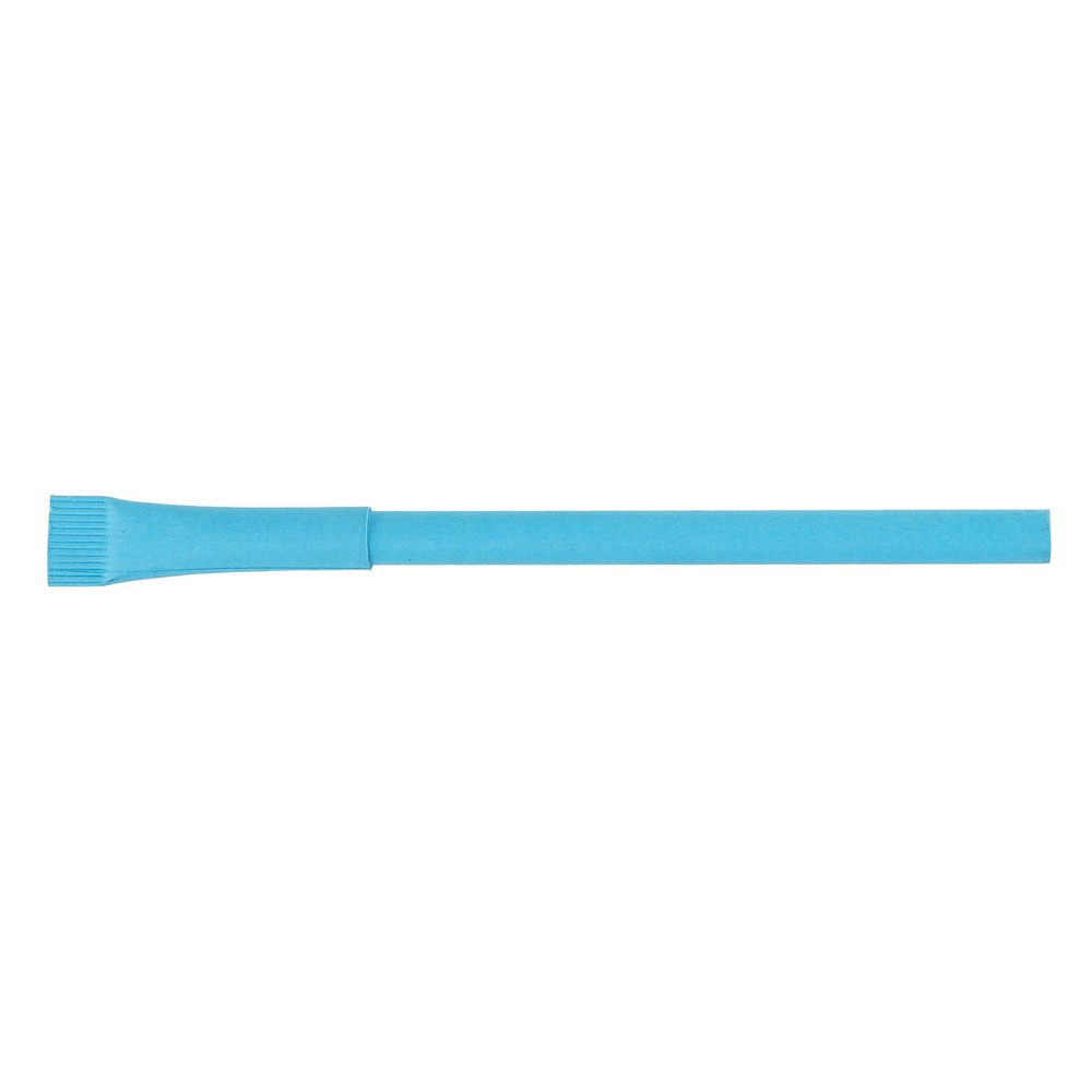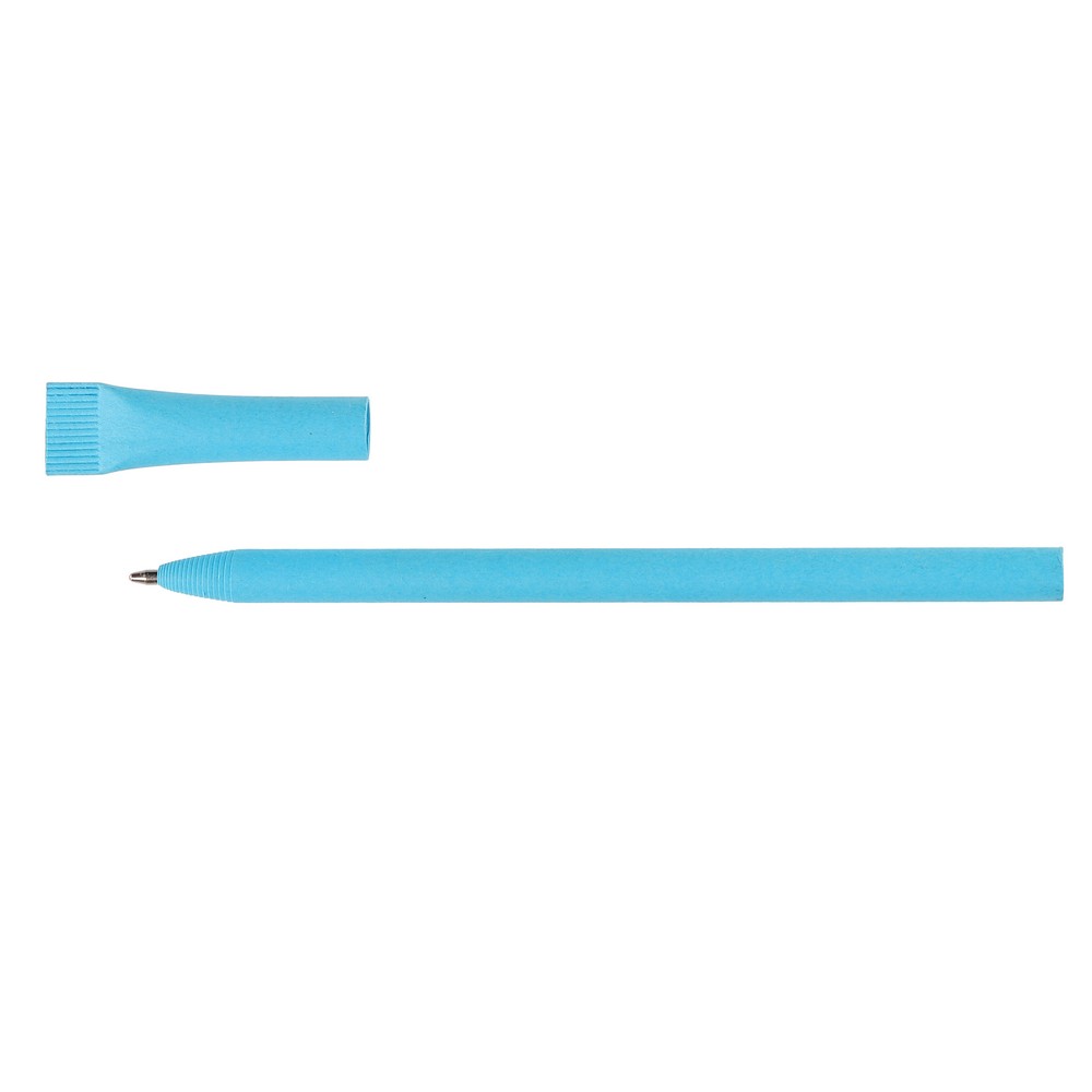 Długopis z dopasowaną kolorystycznie zatyczką, trzon z ciętym zakończeniem, wkład w niebieskim kolorze, produkt wykonany ze zrolowanego papieru