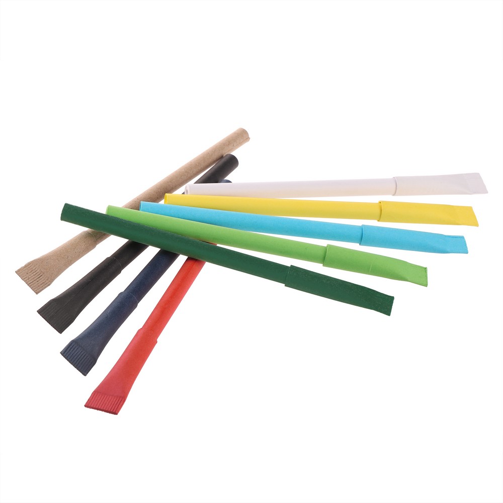 Długopis z dopasowaną kolorystycznie zatyczką, trzon z ciętym zakończeniem, wkład w niebieskim kolorze, produkt wykonany ze zrolowanego papieru
