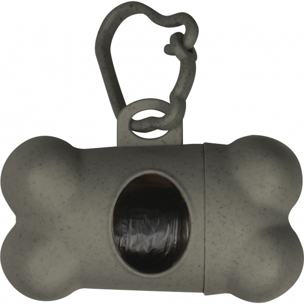 Dozownik torebek na psie odchody w kształcie kości z plastikowym karabińczykiem i 15 biodegradowalnymi torebkami.