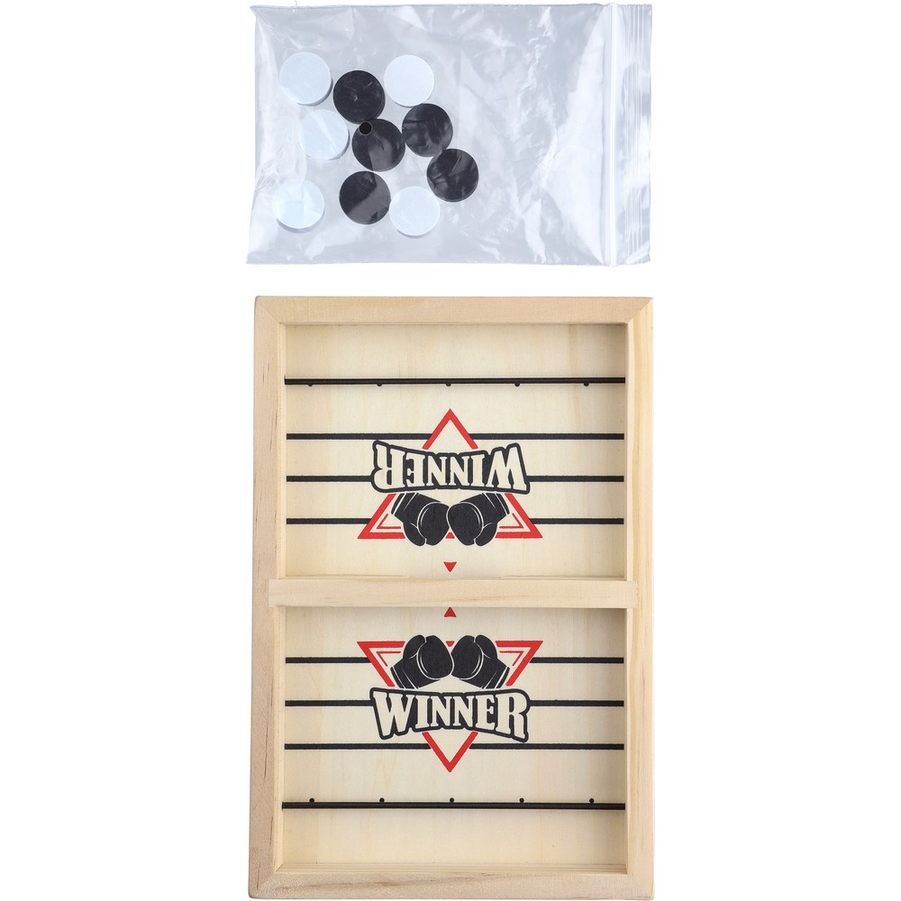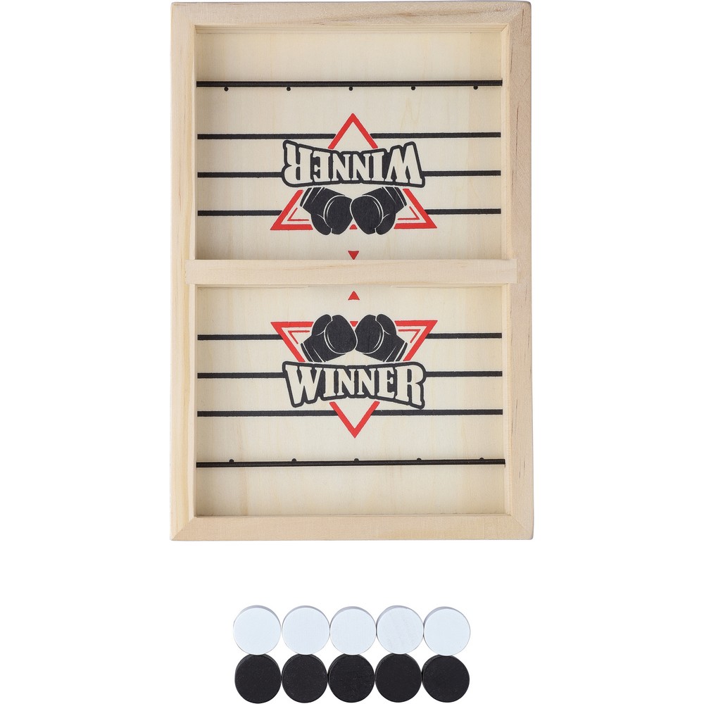 Drewniana gra zręcznościowa, 10 żetonów (5 białych, 5 czarnych), krótka instrukcja w komplecie, produkt pakowany w papierowy kartonik z ilustracją z przodu