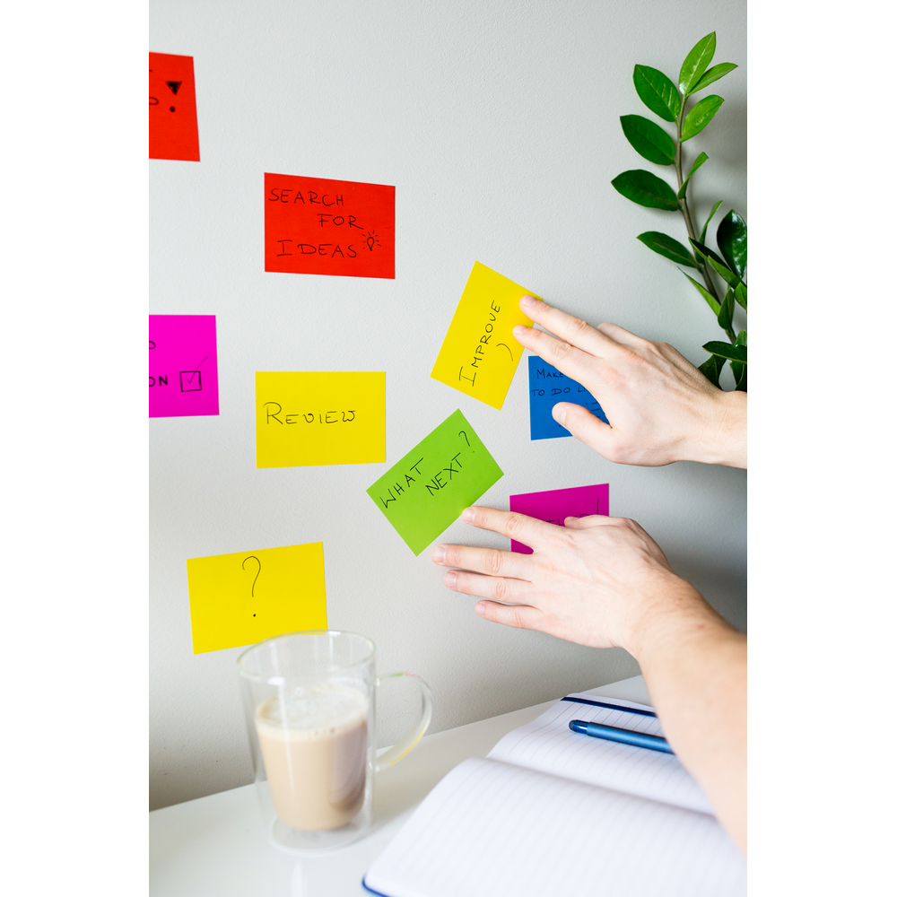 Karteczki samoprzylepne, przylegają do powierzchni za pomocą ładunku elektrostatycznego, dzięki czemu nie zostawiają śladów po kleju na powierzchniach, umożliwiają łatwą reorganizację notatek np. podczas szkoleń lub prezentacji, 100 szt., produkt wykonany z papieru oraz folii PP. Wyprodukowany w Europie.