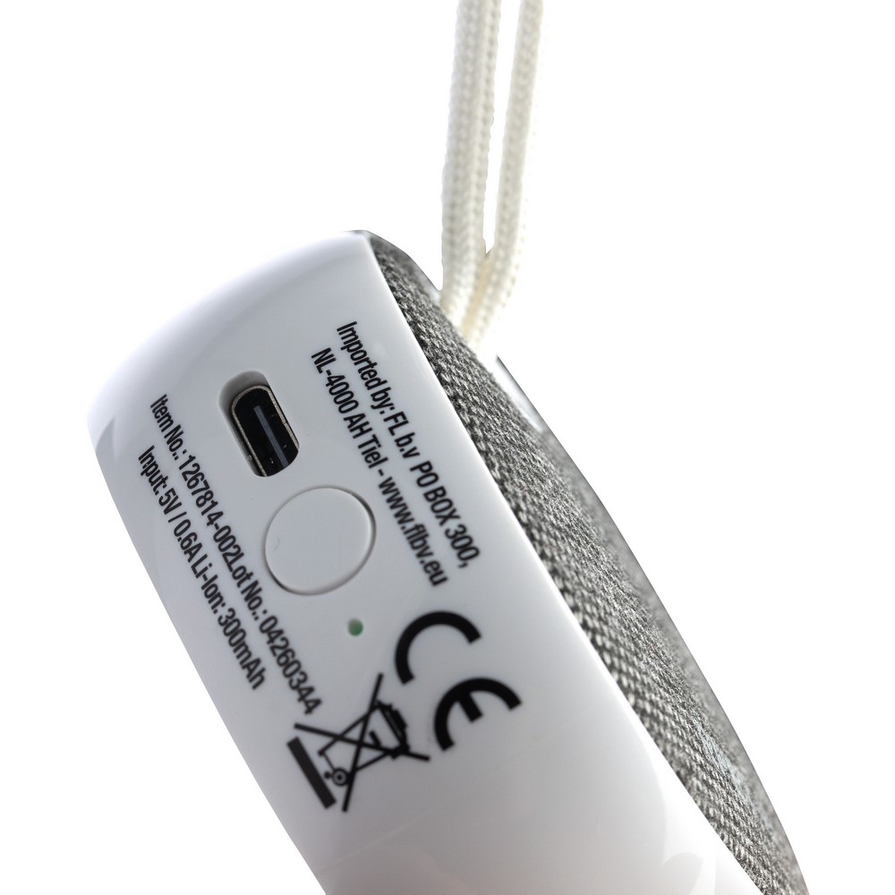 Głośnik bezprzewodowy BT 5.3, 3W, bateria 300 mAh, zasięg: 10 m, sznurek ułatwiający noszenie, biały kabel USB 30 cm w komplecie, ikona RPET na tkaninie, ikona recyklingu na produkcie, zapakowany w brązowe kartonowe pudełko, produkt wykonany z ABS i RPET