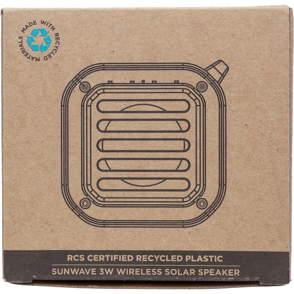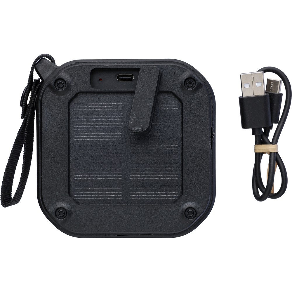Głośnik bezprzewodowy, IPX6 co oznacza ochronę przed strumieniem wody przez 3 minuty, opaska na nadgarstek i karabińczyk umożliwiający przypinanie, moc wyjściowa 3 W, wejście DC 5 V, wbudowany akumulator 400 mAh, działa w odległości 15-20 metrów od źródła sygnału, stosunek sygnału do szumu 75 dB, częstotliwość 100 Hz-20 K Hz, kabel ładujący o długości 30 cm typu C w zestawie, wbudowana latarka LED (30 lumenów), panel słoneczny wydłużający czas użytkowania, 4 godziny czasu gry, BT 5.3, zapakowany w brązowy kartonik, produkt wykonany z ABS z recyklingu, PVC