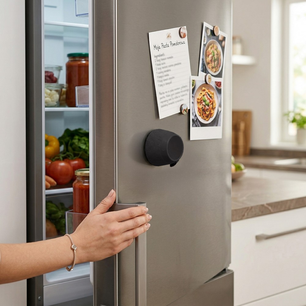 Głośnik bezprzewodowy 5W z wbudowanym magnesem w podstawie, umożliwiający stabilne mocowanie do metalowych powierzchni, kompaktowa obudowa z górną blaszką przeznaczoną pod grawer, idealny do odtwarzania muzyki w podróży i na biurku, ładowany przez USB-C