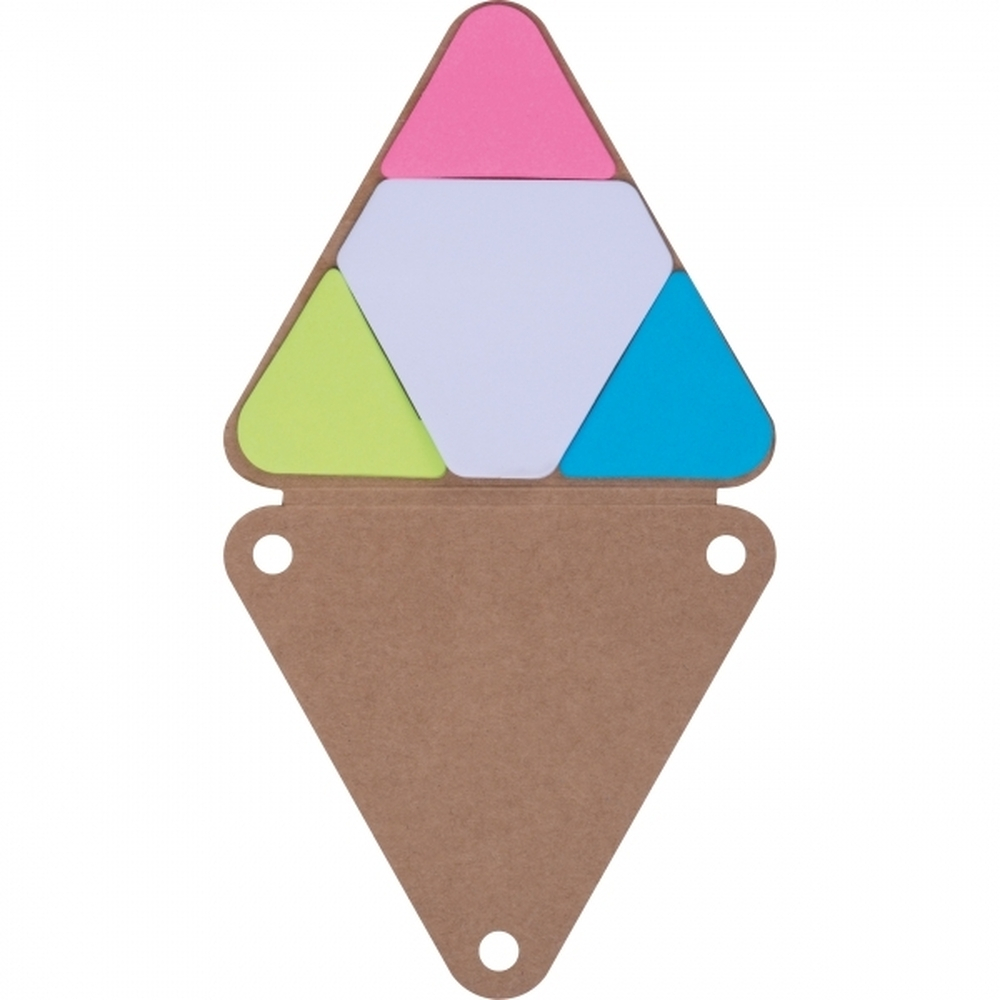 Trójkątny bloczek z karteczkami samoprzylepnymi . Bloczek zawiera 20 większych białych karteczek samoprzylepnych i 3 x 20 mniejszych kolorowych karteczek samoprzylepnych.