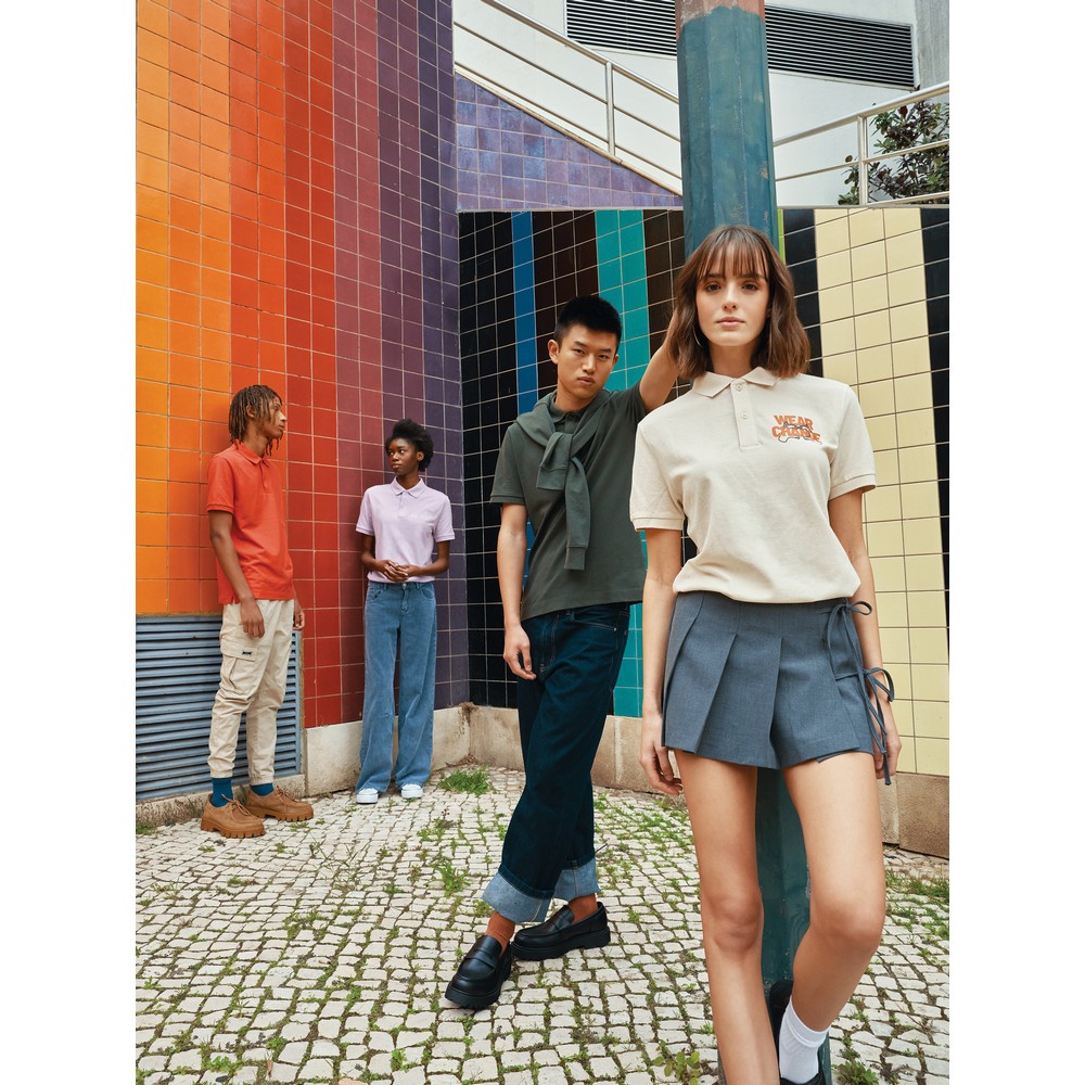 Koszulka polo, unisex, zapięcie na 2 guziki, regularny krój, splot Pique, 2 rozporki po bokach, krótkie rękawy, wykonana w 50% z bawełny z recyklingu i w 50% z bawełny organicznej o gramaturze 220 g/m2, bez dodatku poliestru, posiada wbudowany znacznik AWARE™, który potwierdza wykorzystanie materiałów z recyklingu, posiada kod QR na metce, który prowadzi do cyfrowego paszportu produktu, 2% wpływów z każdego sprzedanego produktu z kolekcji Impact jest przekazywane na rzecz Water.org