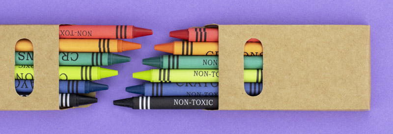 Kredki świecowe w sześciu kolorach, zapakowane w ekologiczny kartonik z okienkiem.
