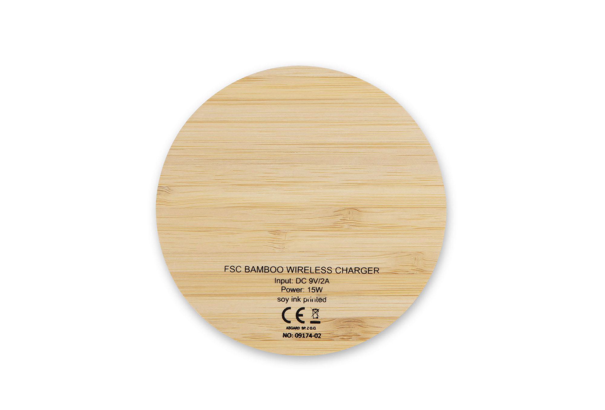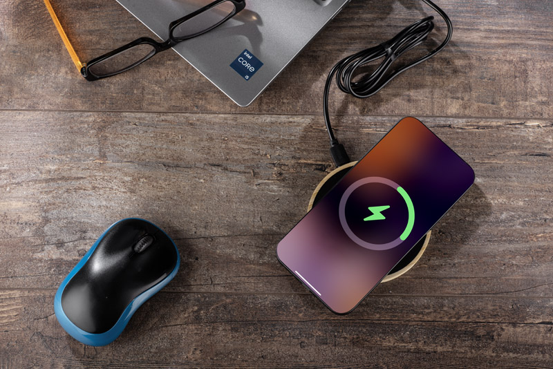 Okrągła ładowarka indukcyjna FRESTI 15W z obudową wykonaną z naturalnego bambusa.