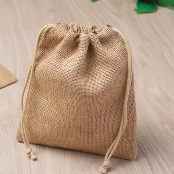 Mały ekologiczny worek z juty, zamykany na sznurki.