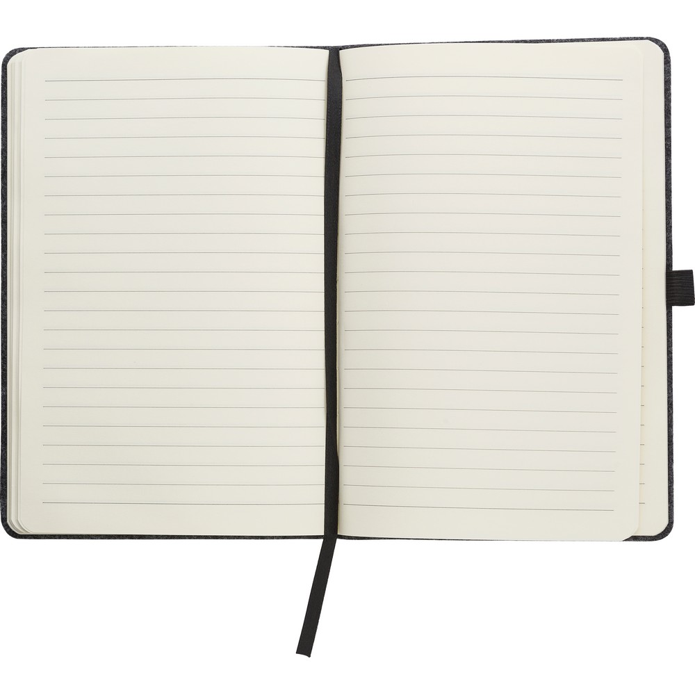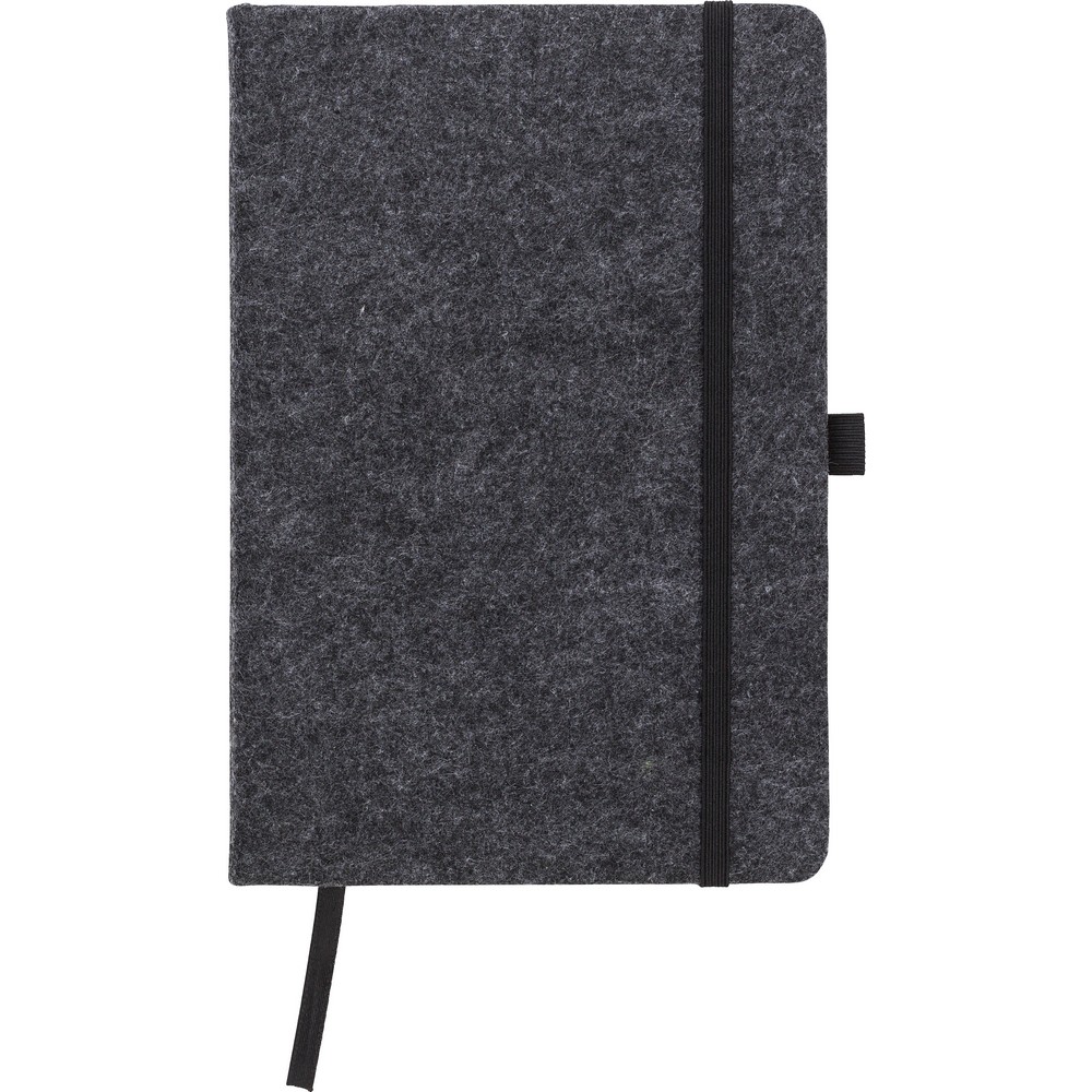 Notatnik A5 (160 kartek w linie), okładka wykonana z filcu RPET, miejsce na przybory do pisania, tasiemka zakładkowa i elastyczna opaska do zamykania