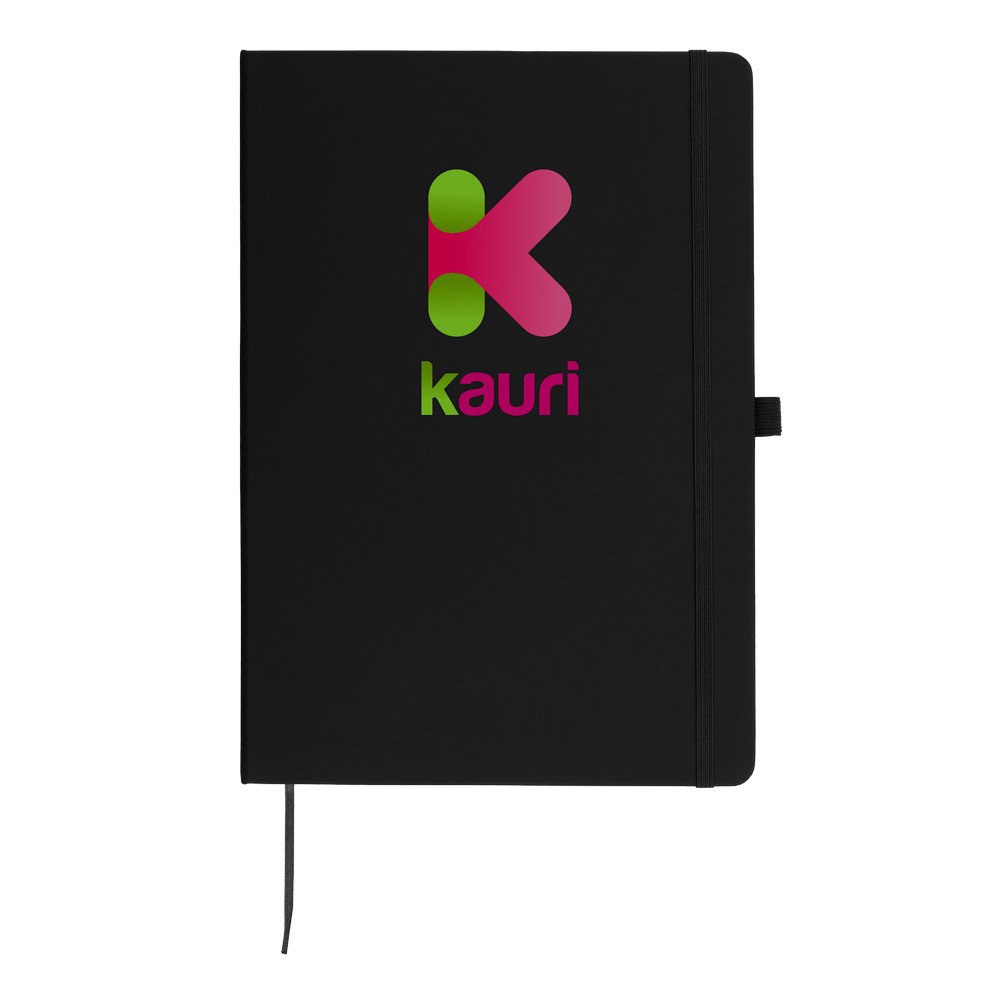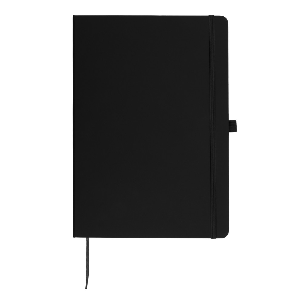 Notatnik w formacie ok. A4, posiada 96 kartek w linie (70 gsm), tasiemka zakładkowa umożliwia wygodne zaznaczanie ostatniej strony lub ważniejszych notatek, dodatkowy gumowy uchwyt na długopis, twarda okładka wykonana z PU