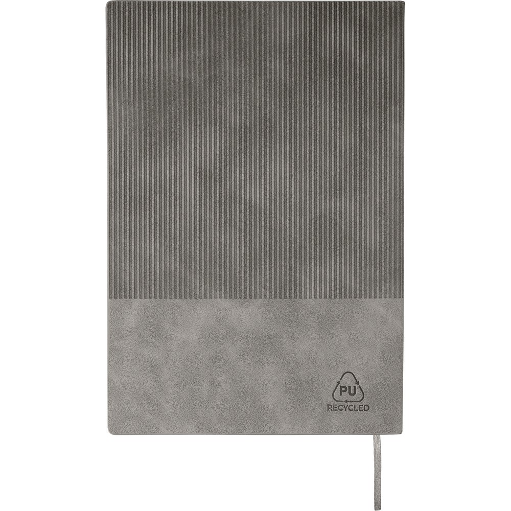 Notatnik ok. A5, 100 stron w linię (80 g/m²), twarda okładka, tasiemka zakładkowa umożliwia wygodne zaznaczanie ostatniej strony lub ważniejszych notatek, wykończenie przypominające sztruks, ikona recyklingu na produkcie, produkt wykonany z PU