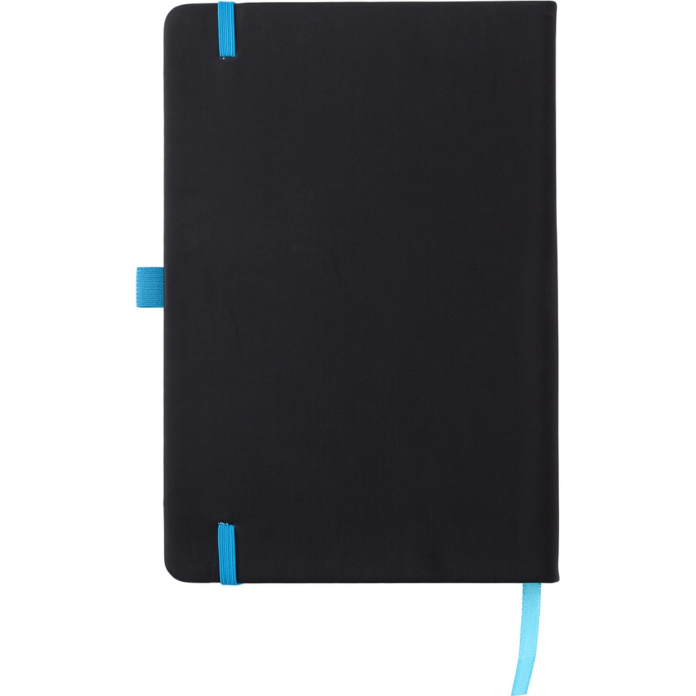 Notatnik (ok. A5, 96 kartek w linie), tasiemka zakładkowa i elastyczna opaska do zamykania, grawer ukazuje powierzchnię w kolorze opaski do zamykania