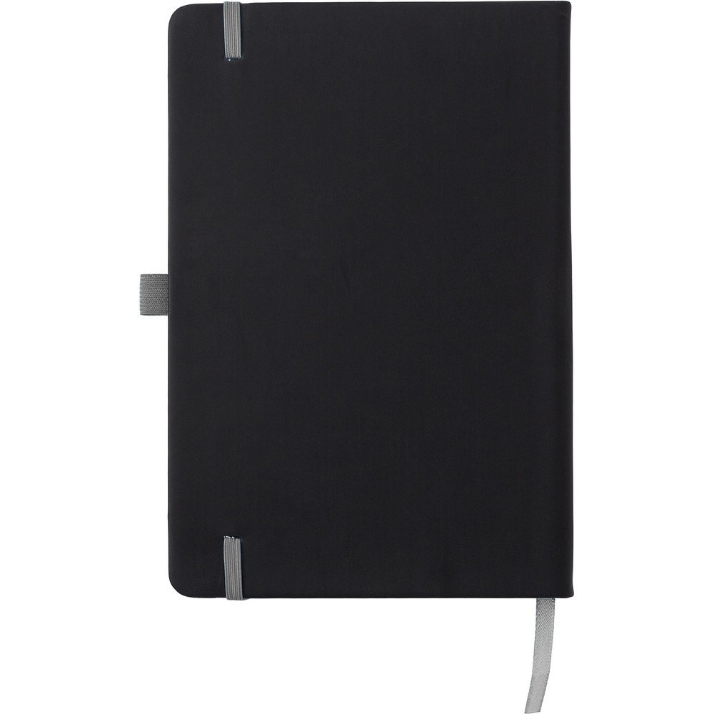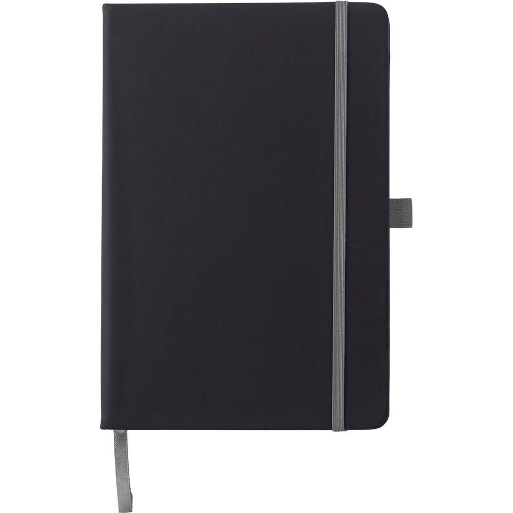 Notatnik (ok. A5, 96 kartek w linie), tasiemka zakładkowa i elastyczna opaska do zamykania, grawer ukazuje powierzchnię w kolorze opaski do zamykania