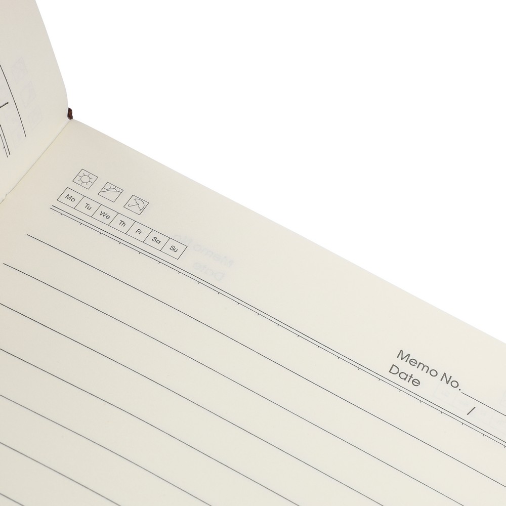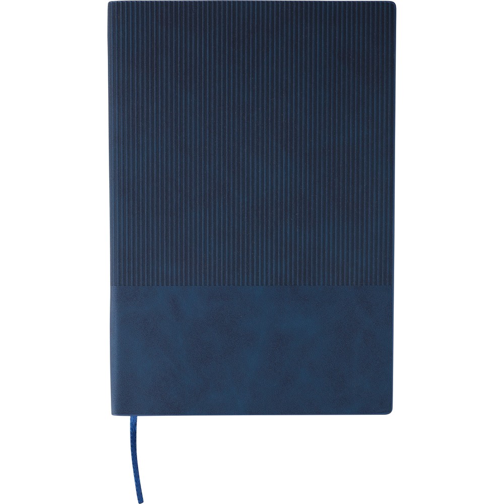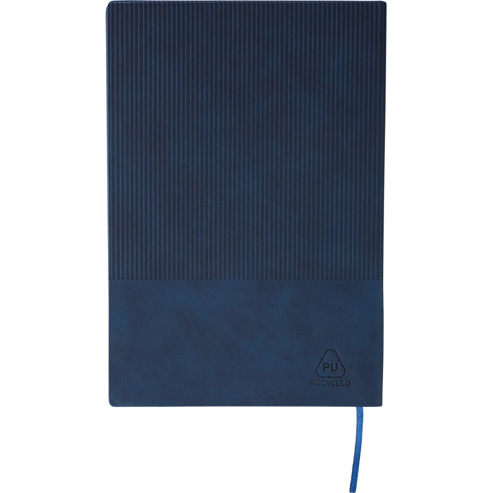Notatnik ok. A5, 100 stron w linię (80 g/m²), twarda okładka, tasiemka zakładkowa umożliwia wygodne zaznaczanie ostatniej strony lub ważniejszych notatek, wykończenie przypominające sztruks, ikona recyklingu na produkcie, produkt wykonany z PU