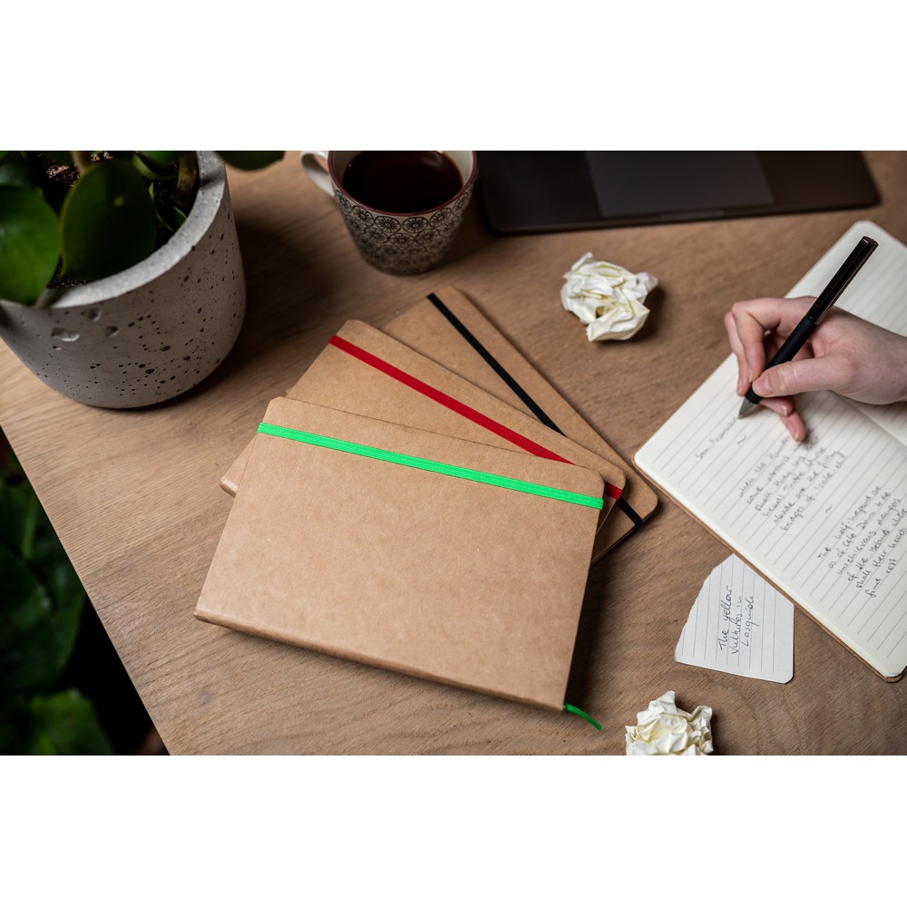 Notatnik w formacie ok. A5, posiada 96 kremowych kartek w linie (192 strony), tasiemka zakładkowa umożliwia wygodne zaznaczanie ostatniej strony lub ważniejszych notatek, dodatkowe zamknięcie w postaci kolorowej elastycznej opaski, twarda okładka wykonana z kartonu z recyklingu