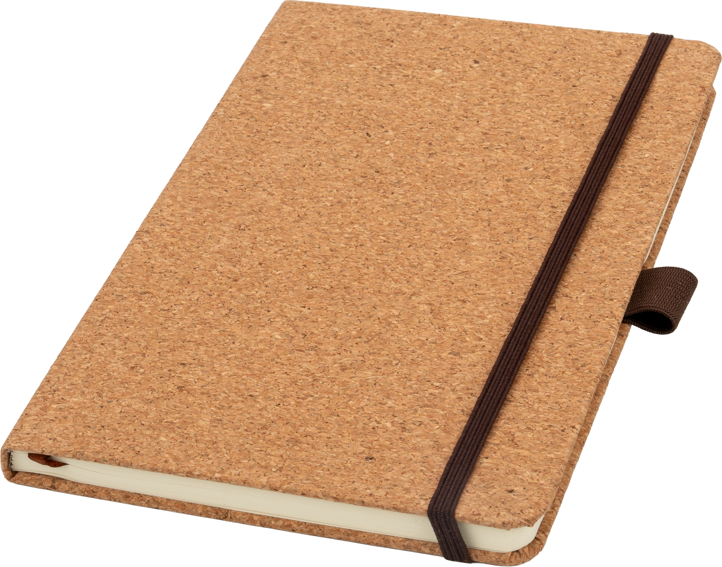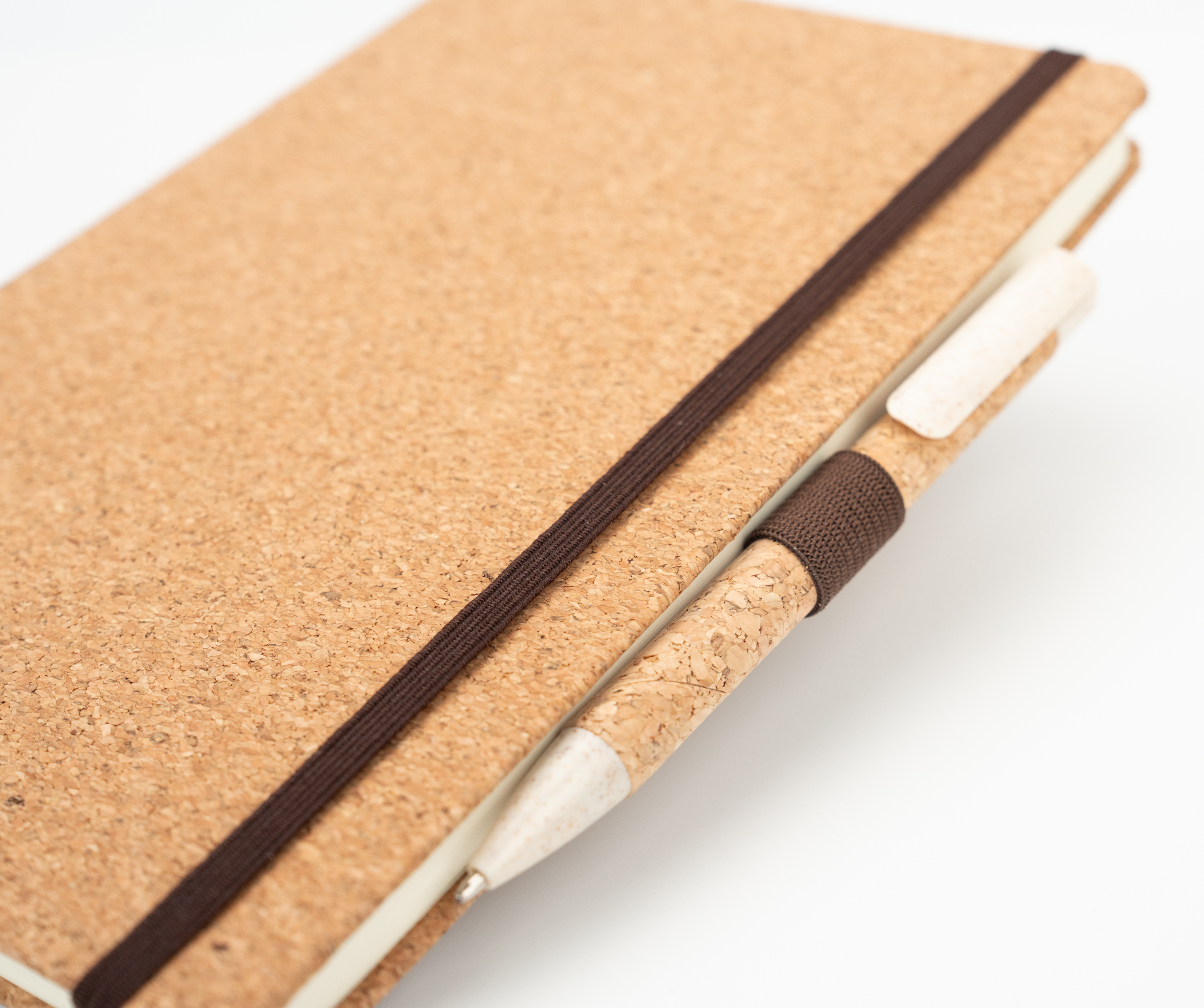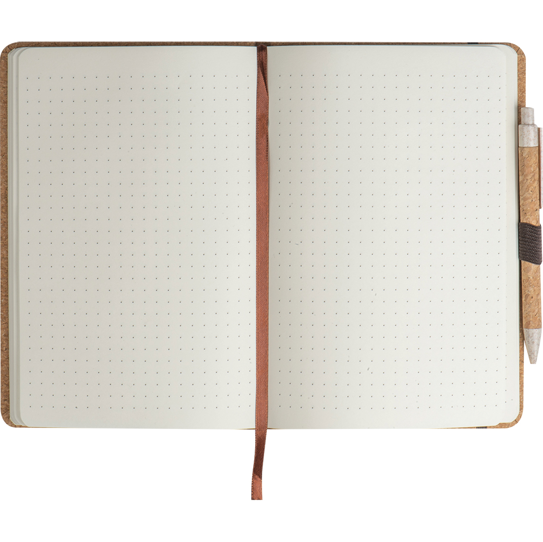 Notatnik A5 w oprawie korkowej z 80 kartkami w kropki, elastycznym paskiem, pętelką na długopis oraz długopisem z pszenicy i z powłoką z korka.