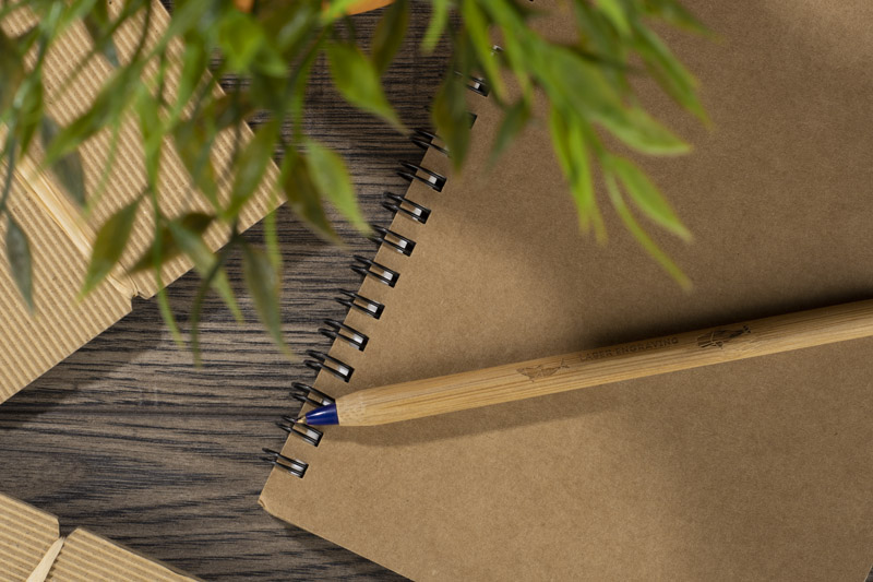 Klasyczny notes na spirali w papierowej, brązowej okładce wraz z miejscem na długopis.