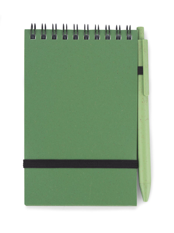 Notes TRESA z długopisem, kolorystyką dopasowanym do okładki. Długopis oraz okładka notesu wykonane są ze słomy pszenicznej. Notes na spirali, posiada 70 kartek w kratkę wykonanych z recyklingowanego papieru. Zamykany za pomocą gumki. Format A6. Wkład w długopisie w kolorze niebieskim.