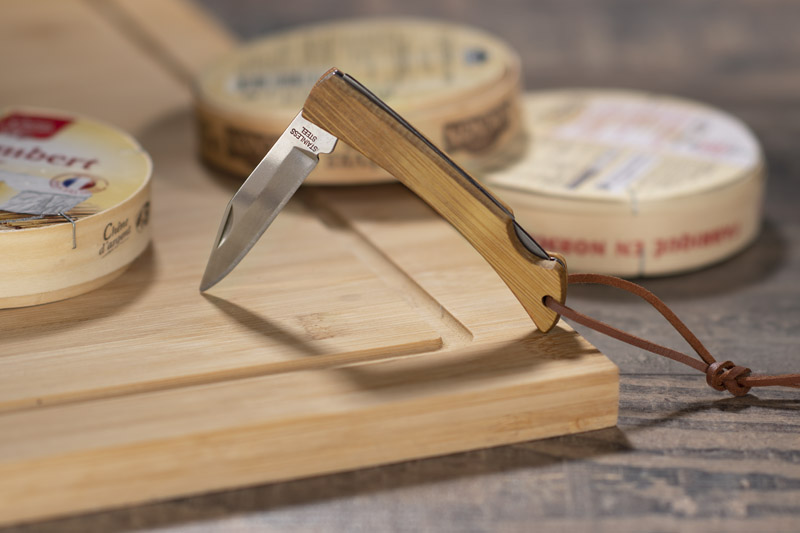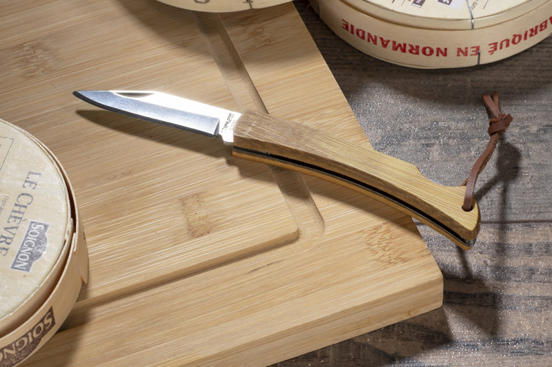 Wykonany z naturalnego drewna uchwyt wraz z rzemykowym paskiem zapewniają świetną ergonomię użytkowania. Zastosowana tylna blokada zapobiegnie niezaplanowanemu złożeniu się ostrza.