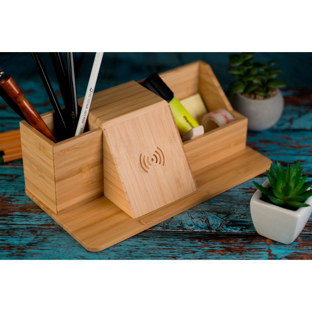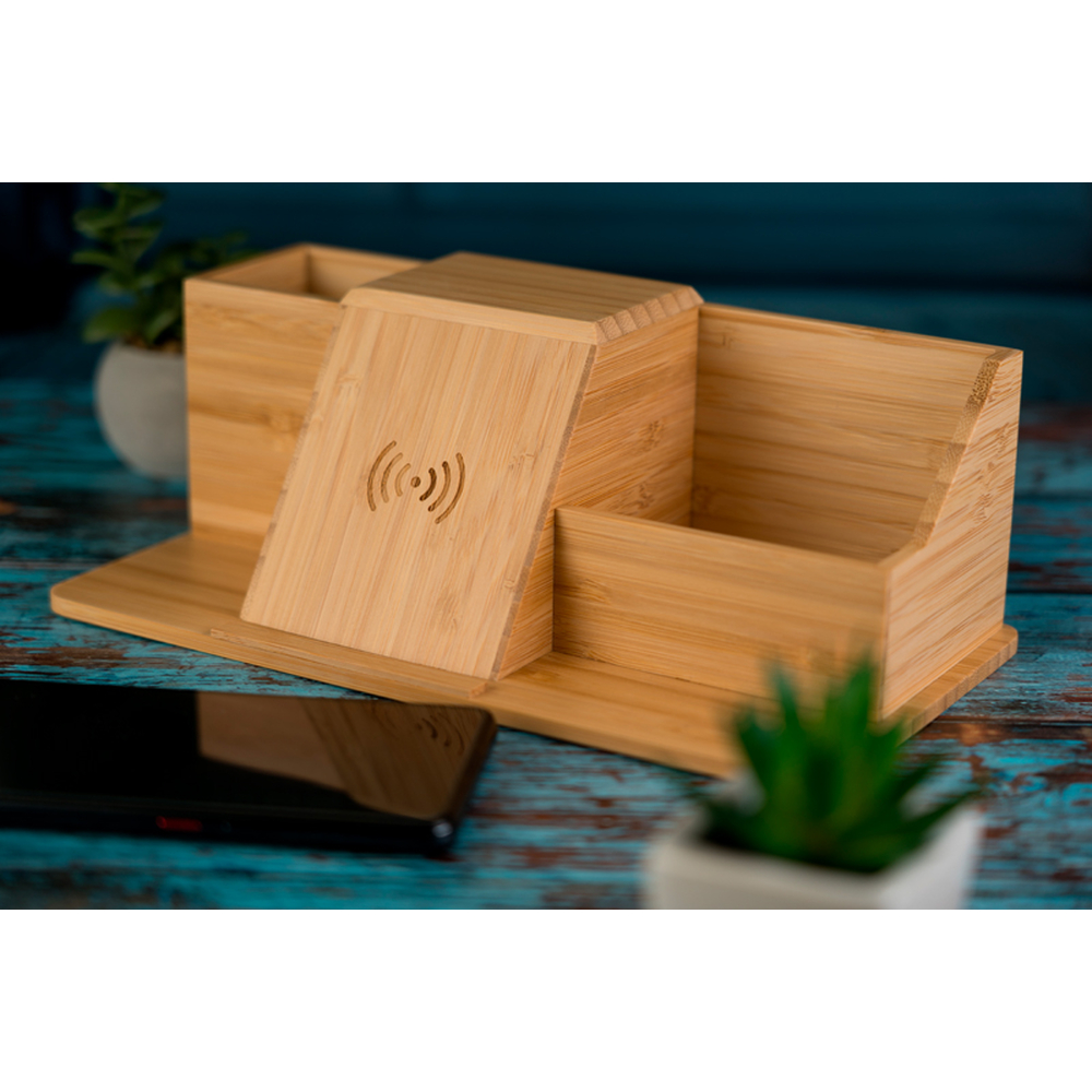 Organizer na biurko wykonany z bambusa, z wbudowaną ładowarką indukcyjną o mocy 10 wat i dwoma przegródkami na przybory biurowe.