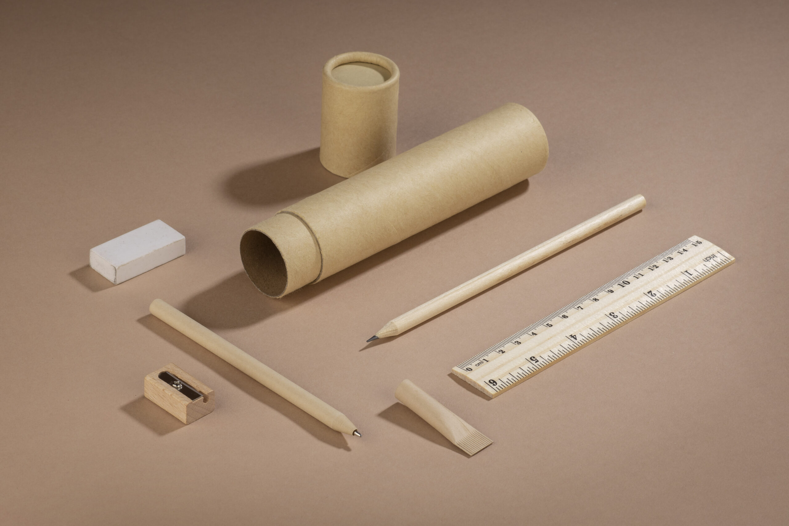 Piórnik ekologiczny wykonany z kraftowego papieru w kształcie tuby. W zestawie: papierowy długopis, drewniany: ołówek, temperówka, linijka oraz gumka do mazania.