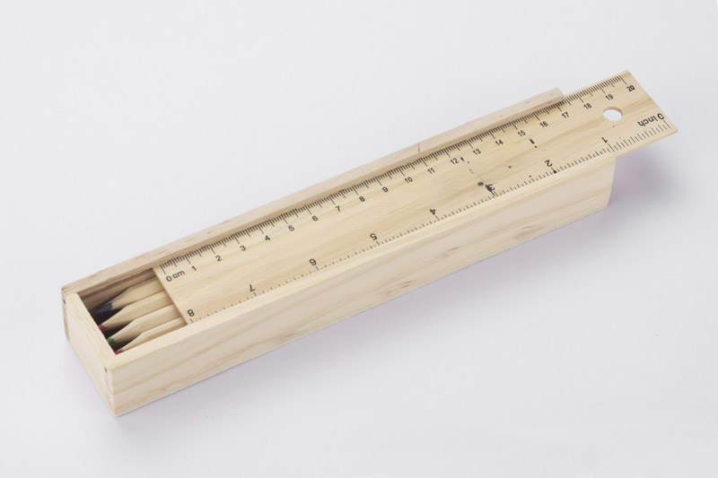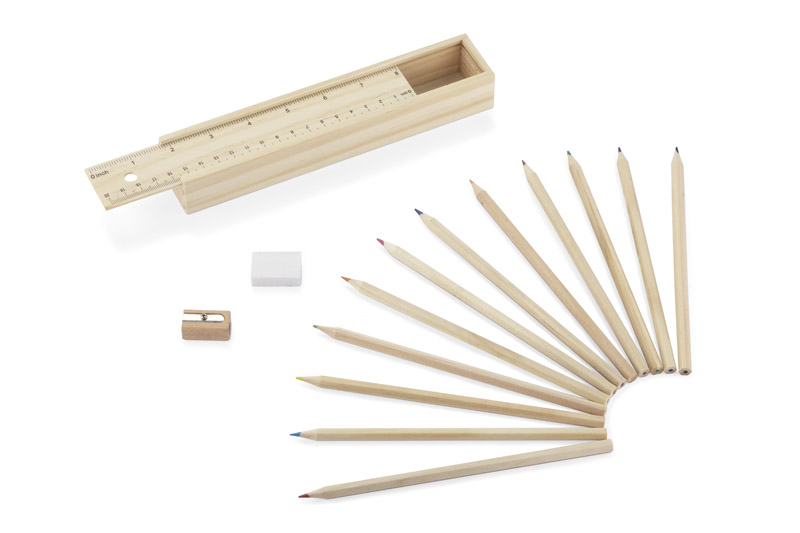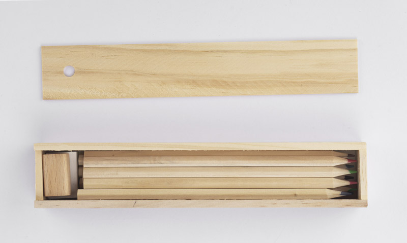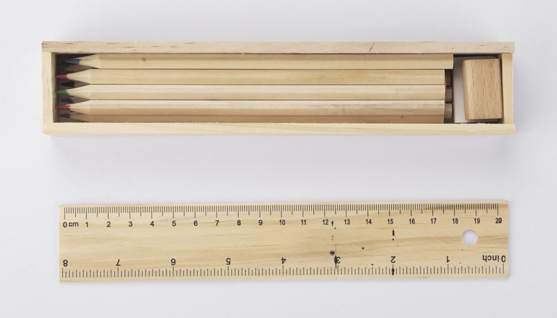 Drewniany piórnik wyposażony w dwanaście drewnianych kredek, linijkę, gumkę oraz temperówkę.