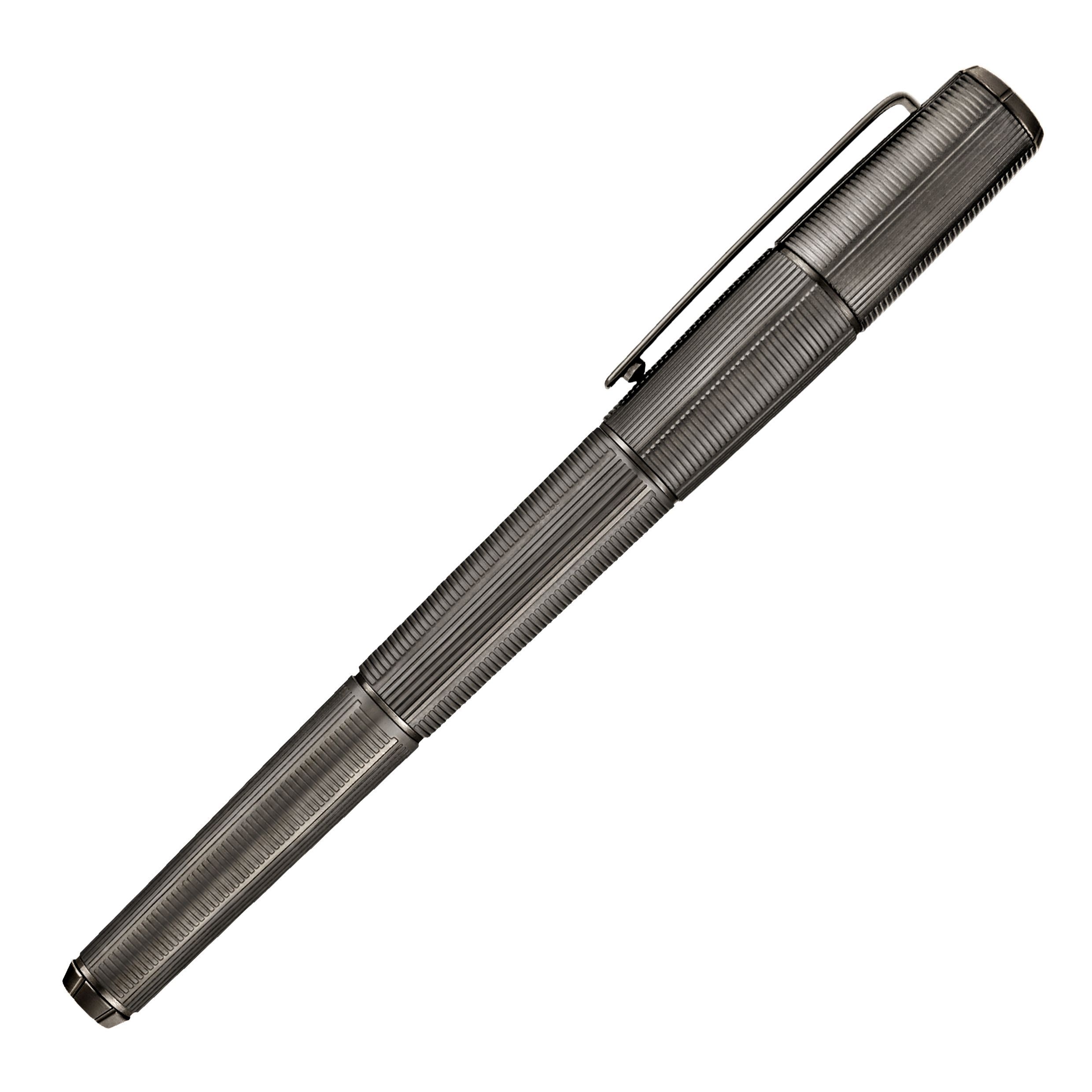 Pióro kulkowe Meridien ukazuje futurystyczną, kanciastą sylwetkę, którą definiuje precyzyjna sekwencja pionowych i poziomych, głęboko grawerowanych pasów.