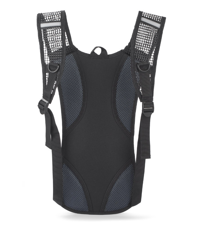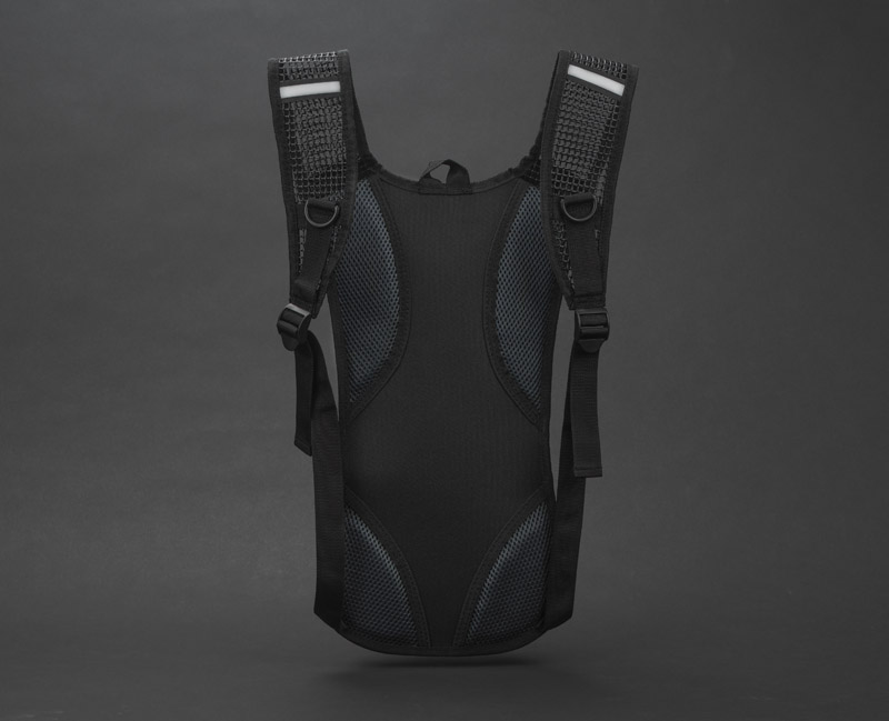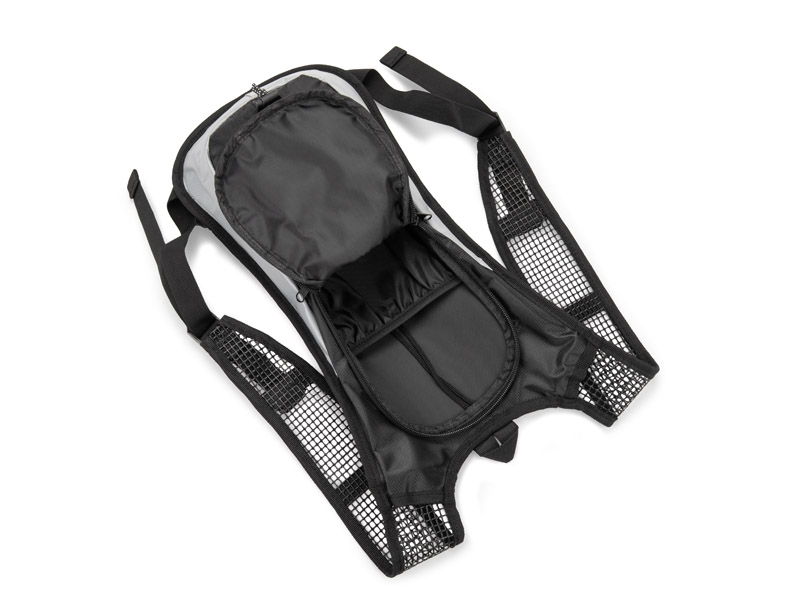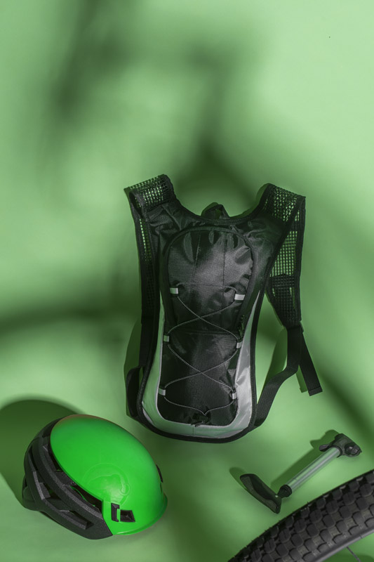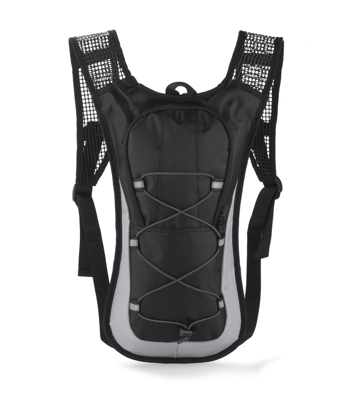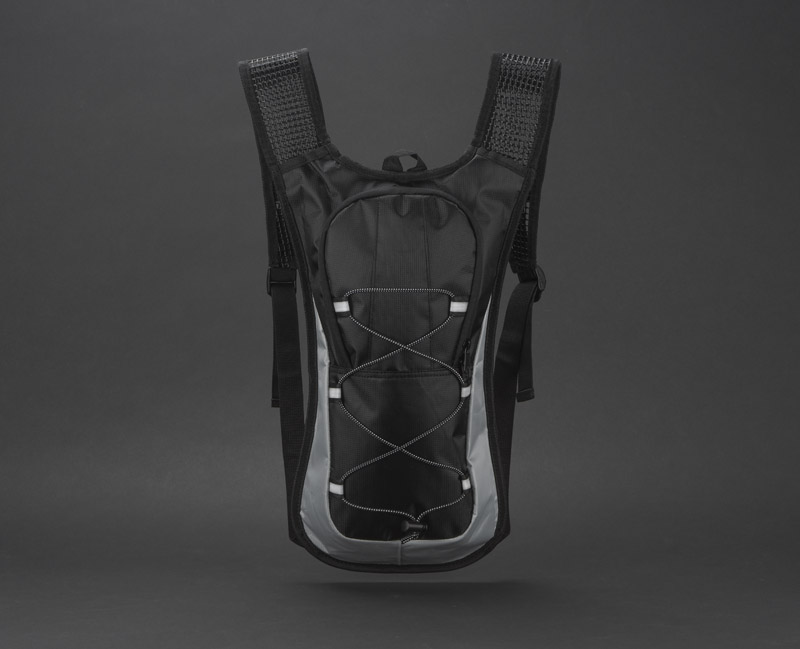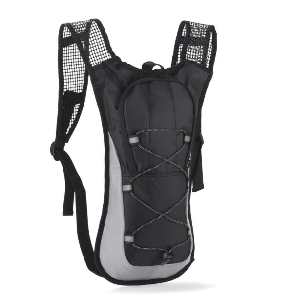 Plecak rowerowy RODE wykonany z wytrzymałego poliestru 420D posiada miejsce na bukłak, siateczkowe szelki z paskami odblaskowymi oraz gumkę ściągającą z przodu.
