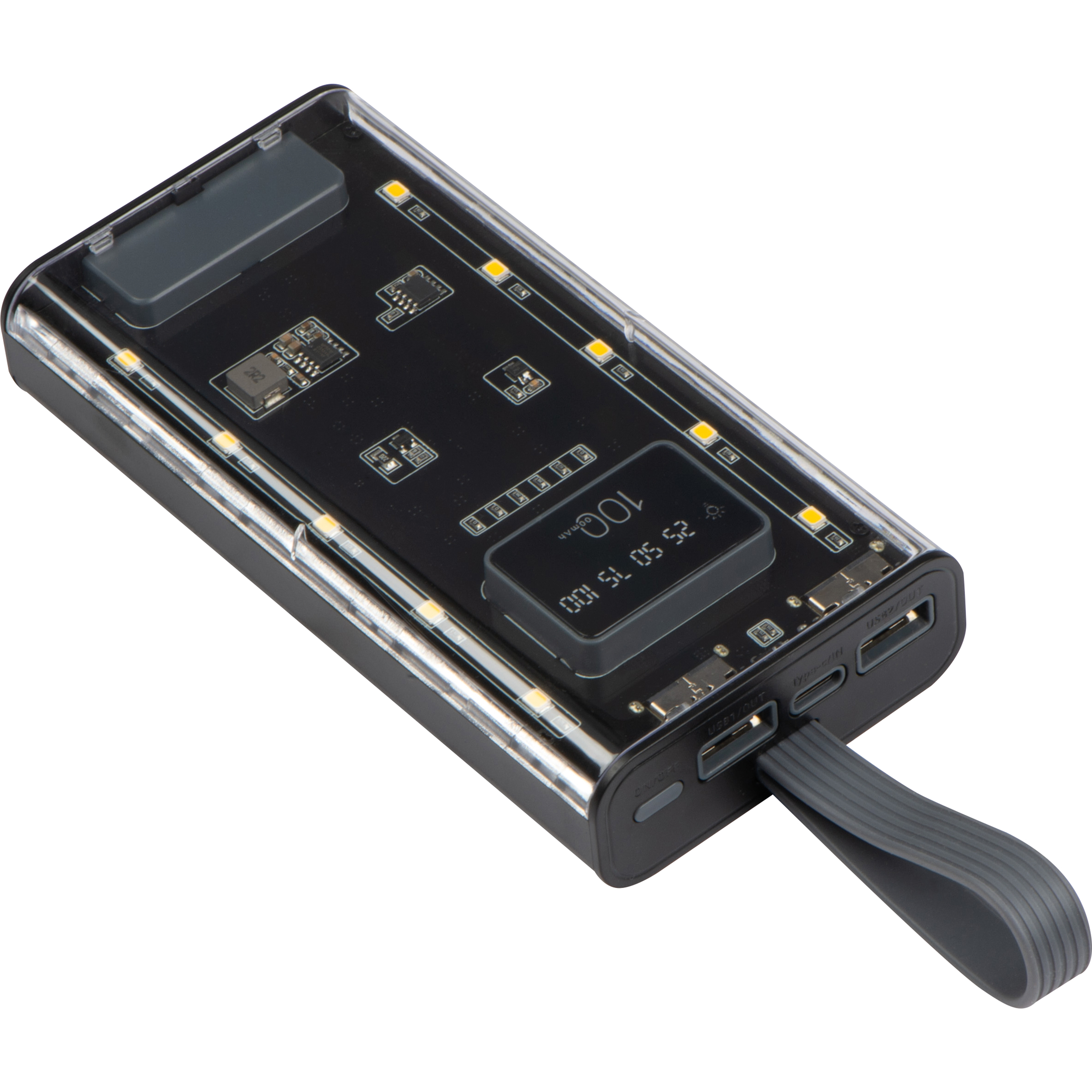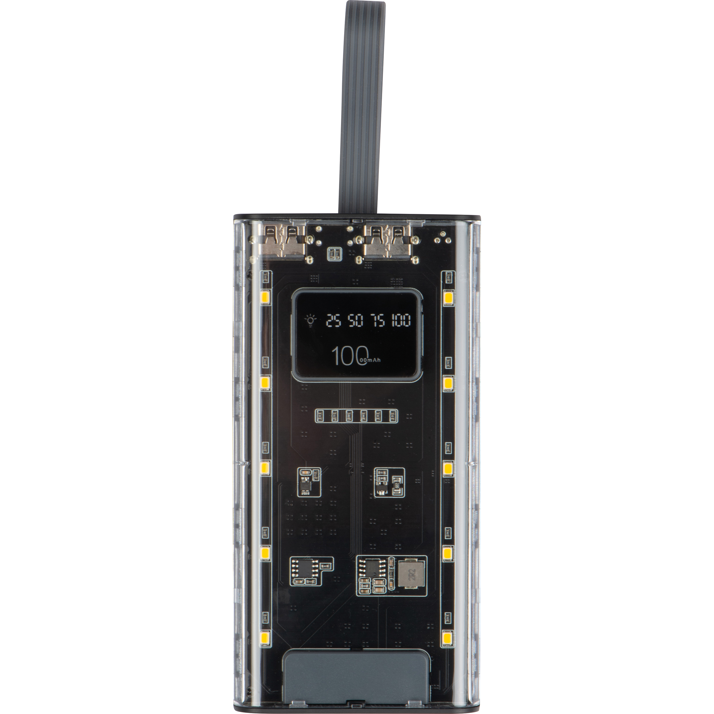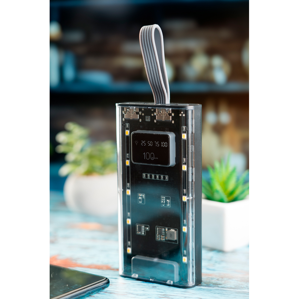 Przezroczysta obudowa nadaje mu nowoczesny, futurystyczny wygląd, który wyróżnia się na tle standardowych power banków. Wbudowany cyfrowy wskaźnik poziomu naładowania baterii pozwala na precyzyjne monitorowanie stanu energii, dzięki czemu zawsze wiesz, kiedy urządzenie wymaga uzupełnienia mocy.