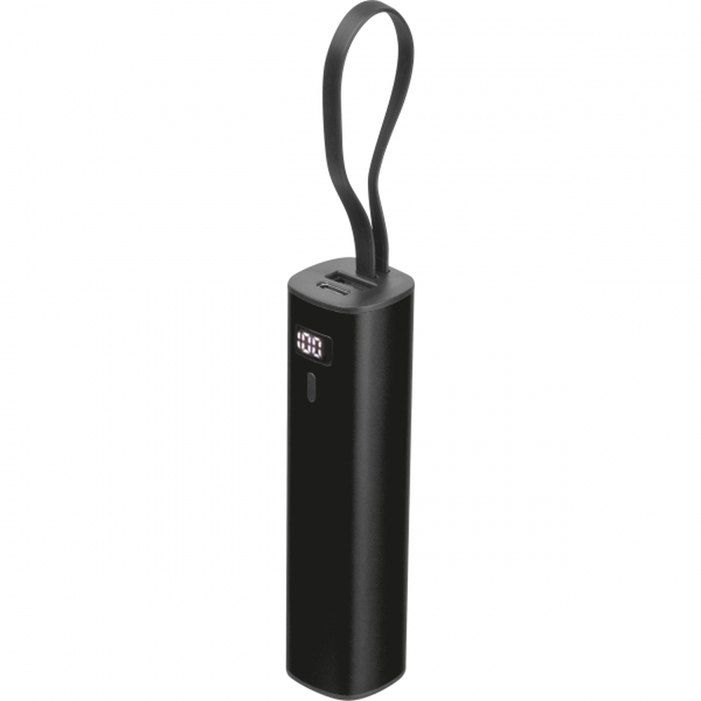 Power bank wykonany z aluminium z akumulatorem Li-ion 5000 mAh, wyświetlaczem poziomu naładowania i zintegrowanym kablem ładującym USB-C.