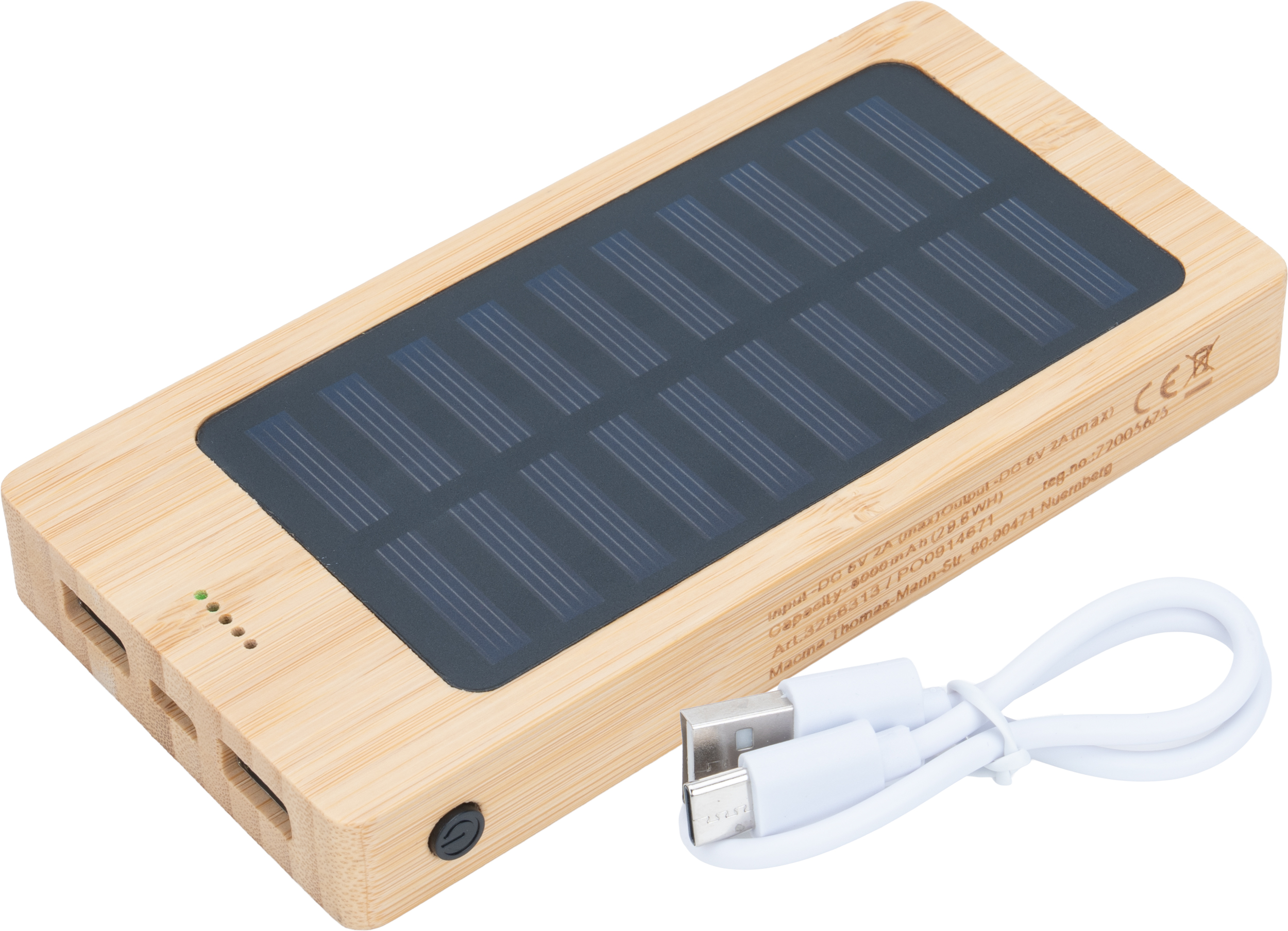 Bambusowy powerbank o pojemności 8 000 mAh z baterią słoneczną i z kablem do ładowania.
