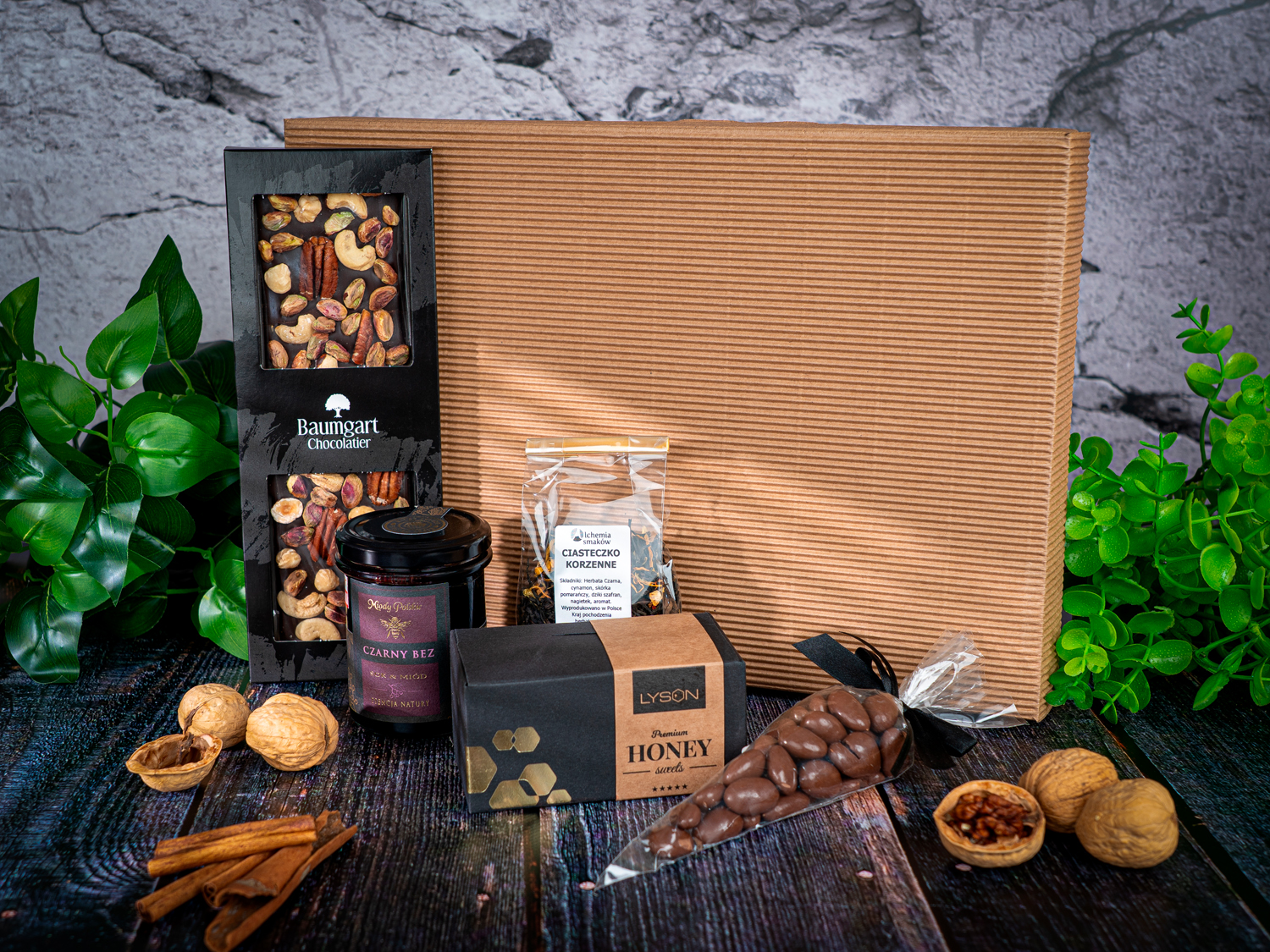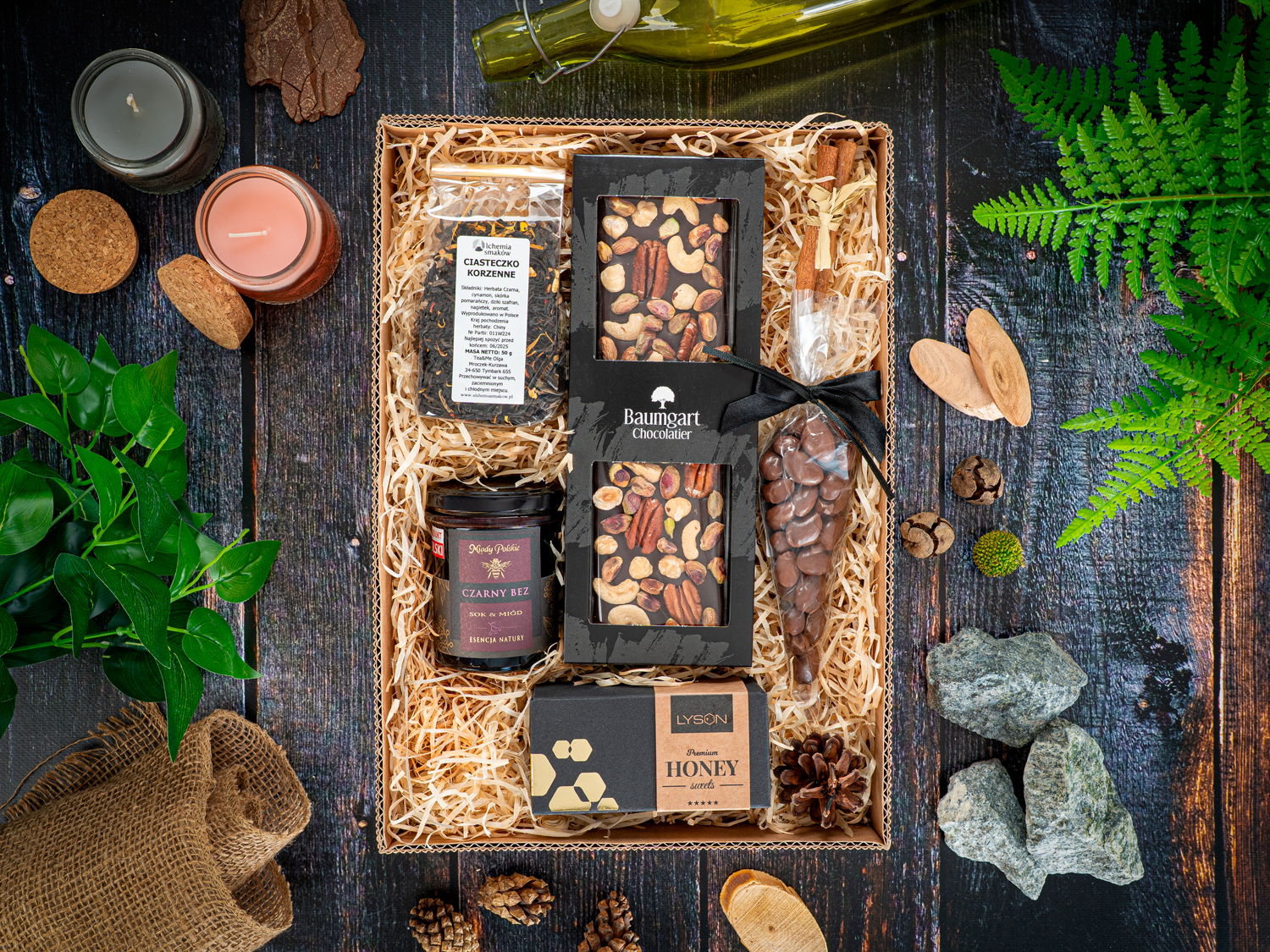 Zestaw prezentowy Korzenna rozkosz to starannie skomponowana kolekcja smaków, która zachwyca nie tylko aromatem, ale i elegancją wykonania. W jego skład wchodzi aromatyczna herbata korzenna (50 g), idealna na chłodne wieczory, której smak doskonale podkreśla naturalna słodycz miodu z sokiem z czarnego bzu (200 g), łącząca delikatną kwaskowatość z bogactwem składników odżywczych. Dla miłośników słodkości przygotowano mleczną czekoladę z orzechami pekan, laskowymi i pistacjami (175 g), miodową krótkę (120 g) oraz chrupiące migdały w czekoladzie (80 g), które tworzą harmonijną całość.