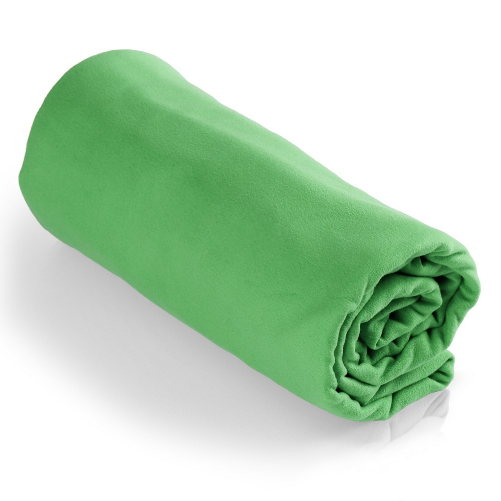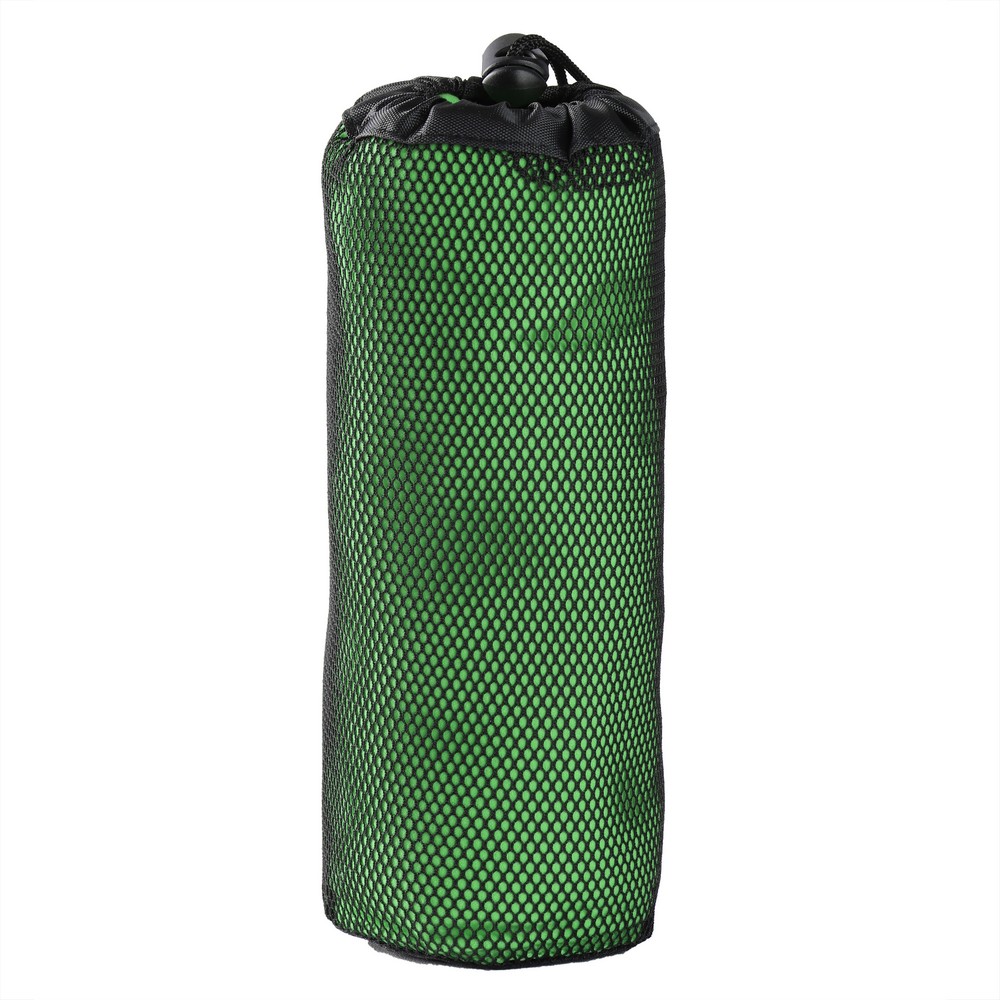 Ręcznik w czarnym, siateczkowym pokrowcu zamykanym na sznurek z klipem, produkt wykonany z mikrofibry o gramaturze 200 g/m2