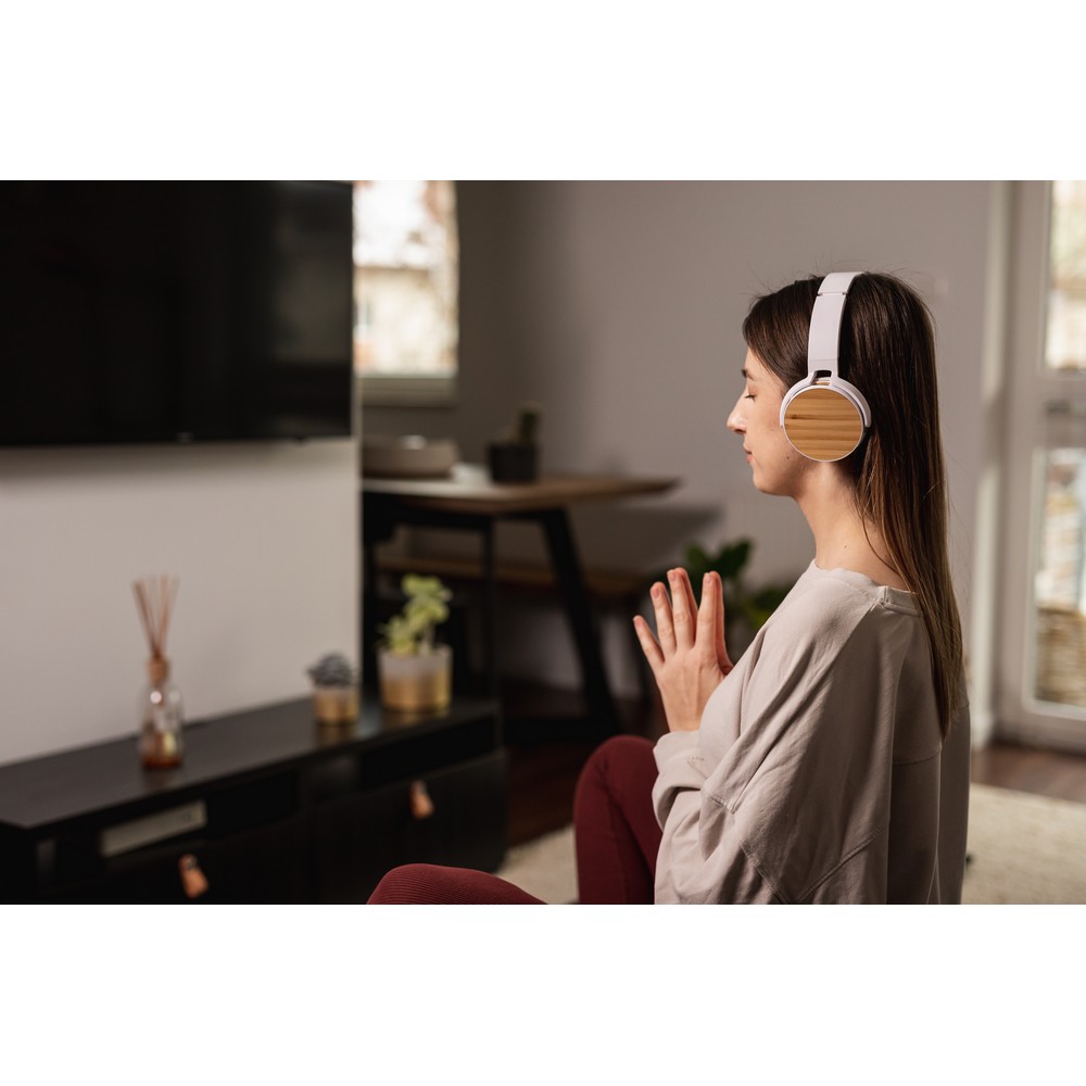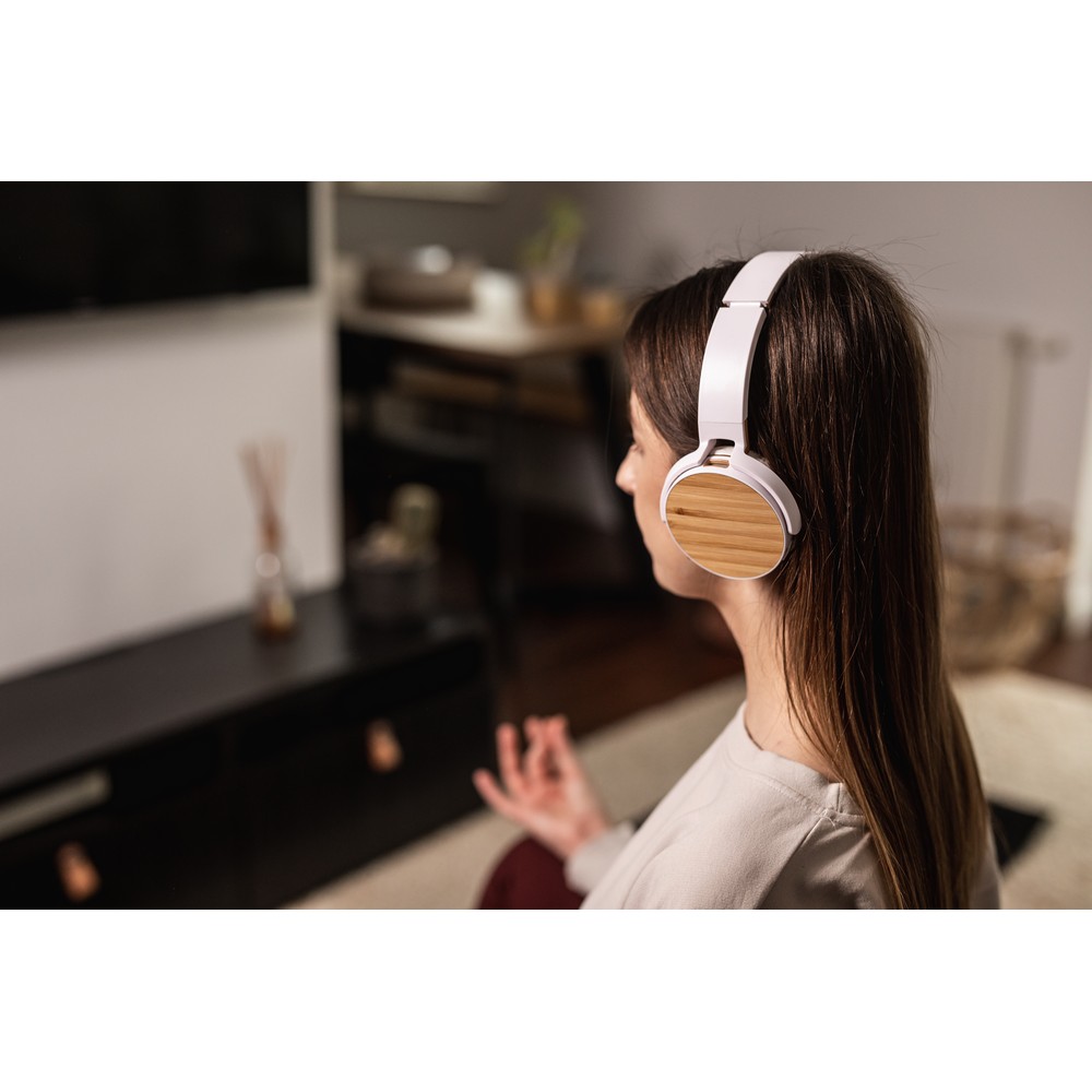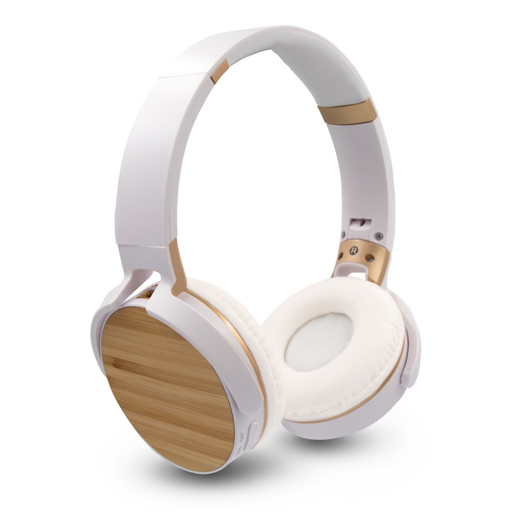 Nauszne słuchawki bezprzewodowe BT 5.0, bambusowe elementy, składane, bateria 200 mAh, czas pracy: 6-8h, czas ładowania: 1-2h, funkcja odbierania połączeń oraz czytnik kart TF (nie dołączona), wbudowany mikrofon, wejście audio, zasięg do 10 m, ładowane przez USB, kabel micro USB w komplecie