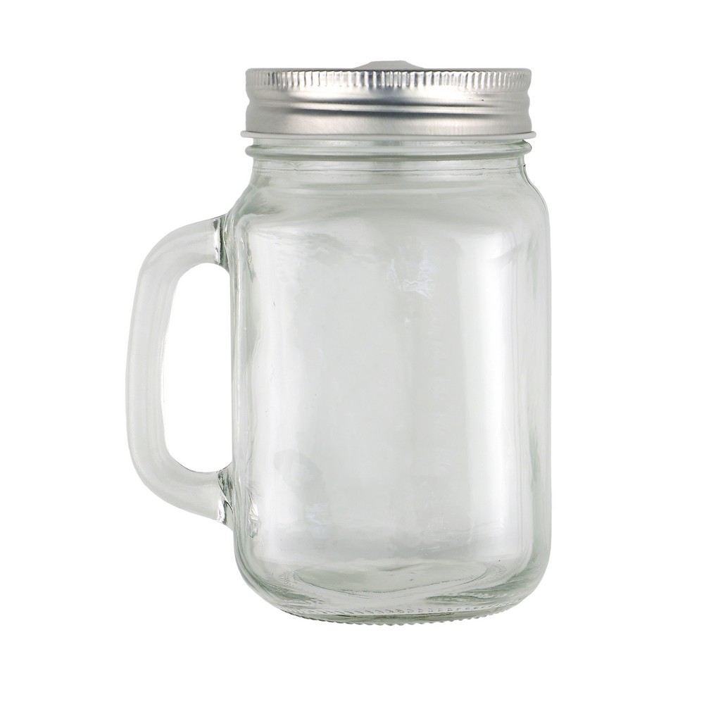 Słoik do picia 480 ml ze słomką, rączką i srebrnym wieczkiem z otworem na słomkę
