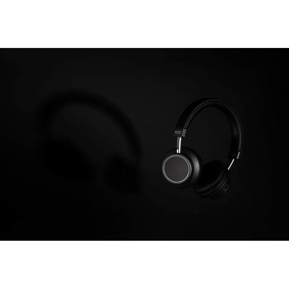 Słuchawki bezprzewodowe, funkcja odbierania połączeń, wbudowany mikrofon, wykonane z aluminium i PU, akumulator o pojemności 300 mAh umożliwia odtwarzanie muzyki do 11 godzin, ponowne ładowanie w 1,5 godziny, składane na płasko, pokrowiec w komplecie, kabel AUX w komplecie, ślad węglowy produktu: 2,19 kg CO2