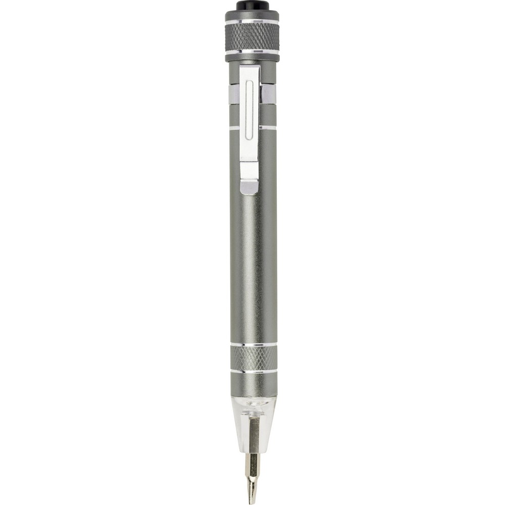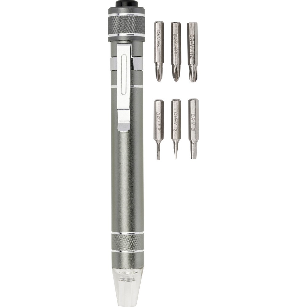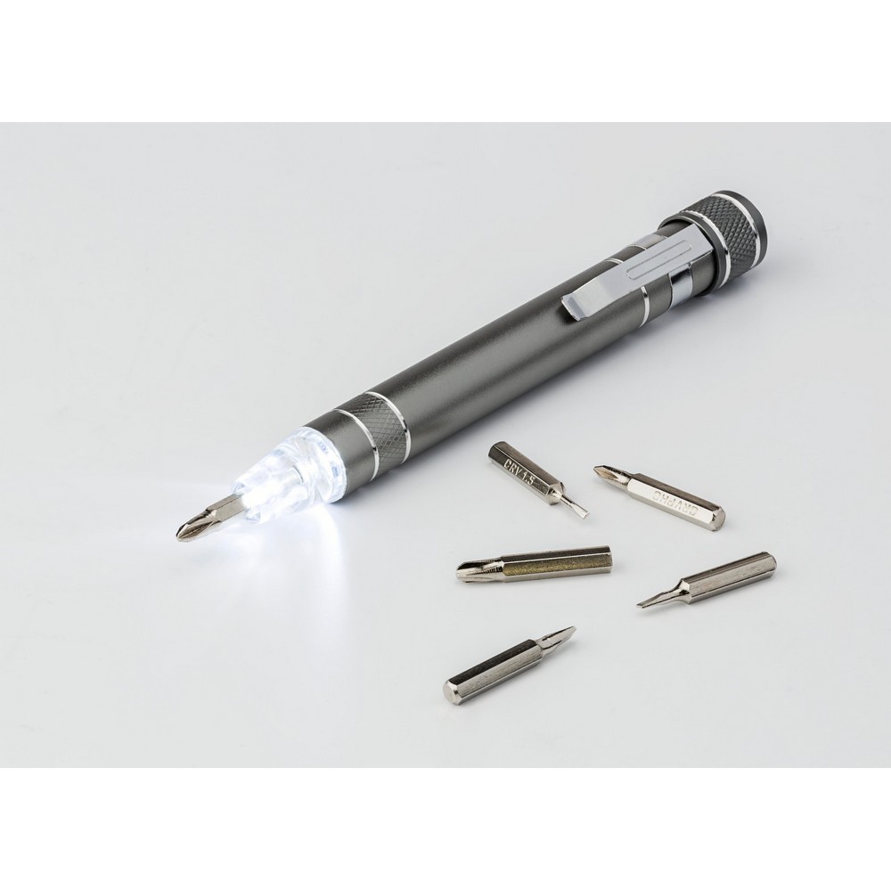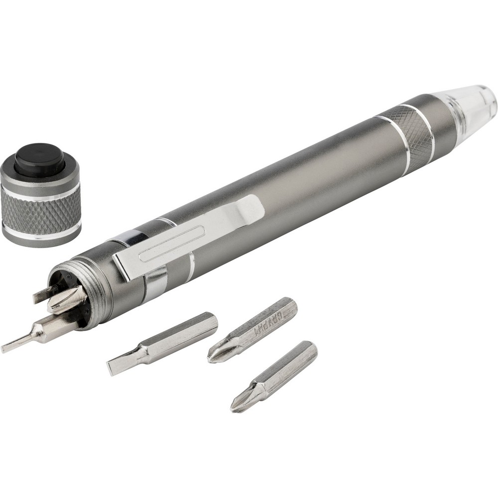 Śrubokręt w kształcie długopisu z lampką LED i końcówkami: 3 płaskie i 3 krzyżakowe