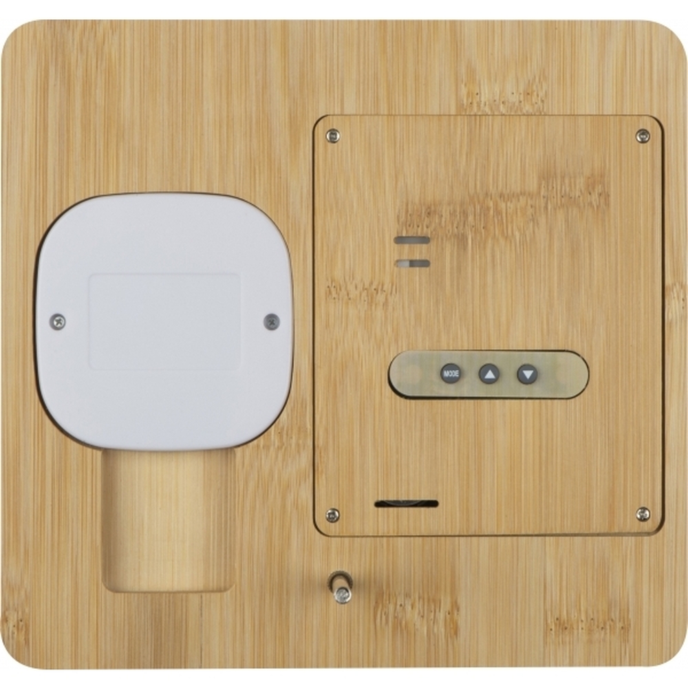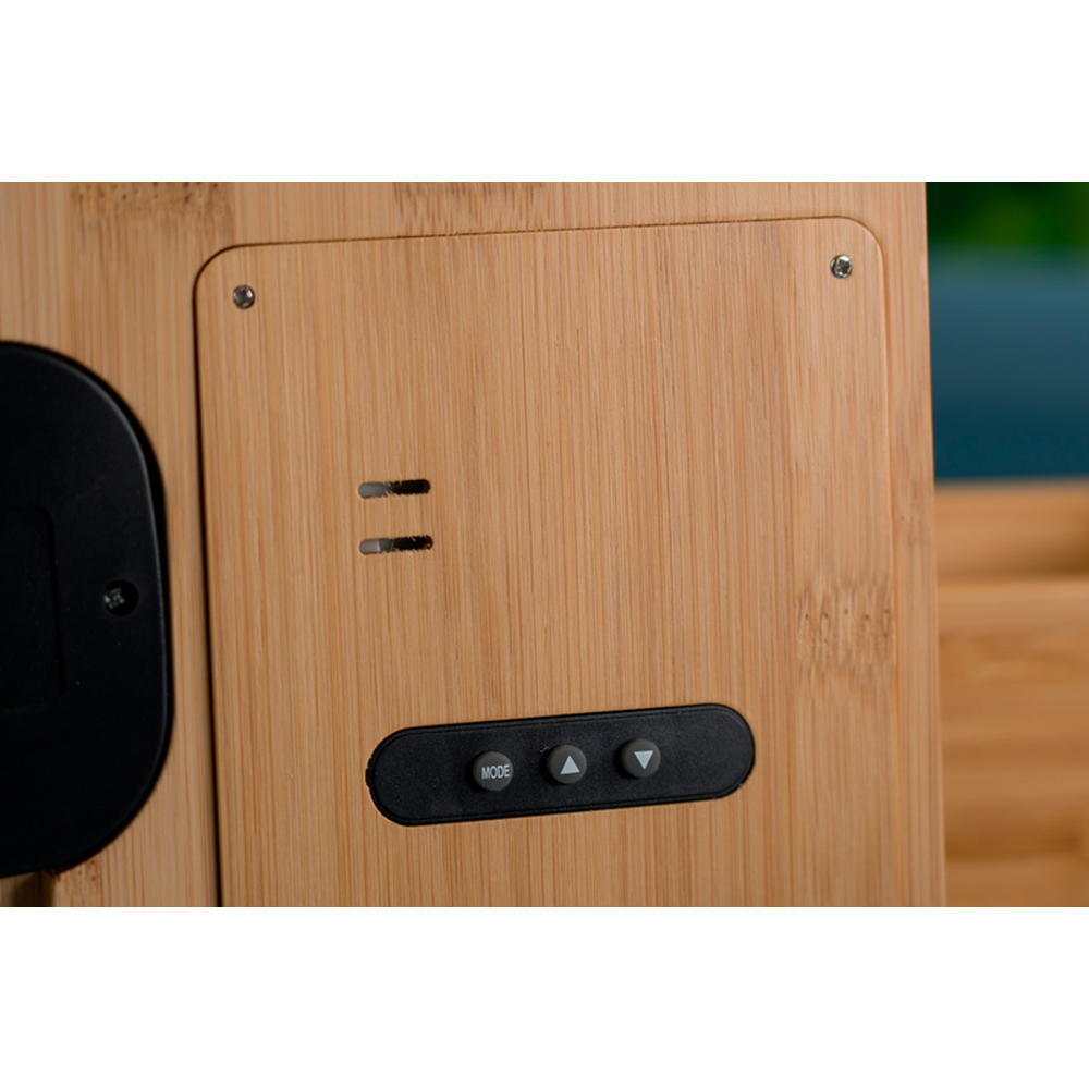 Stacja pogodowa wykonana z drewna bambusowego, z cyfrowym wyświetlaczem ukazującym: czas, temperaturę oraz wilgotność powietrza.
