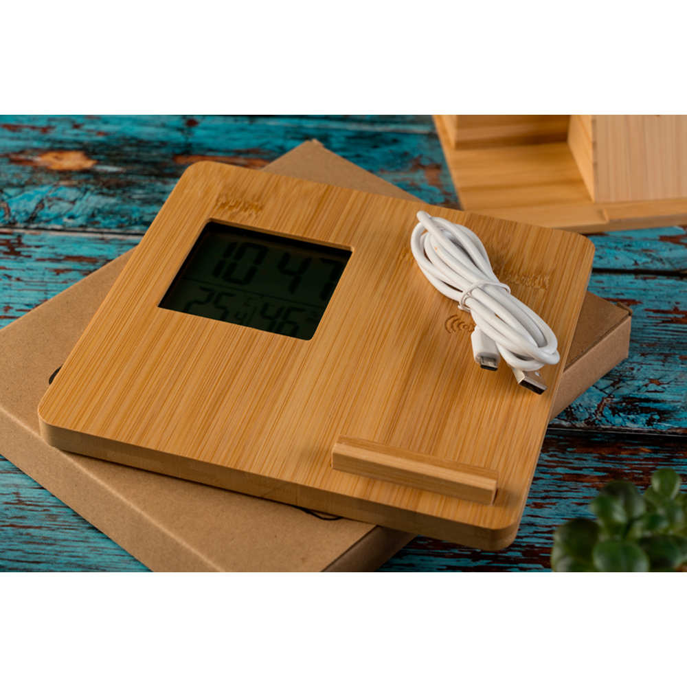 Stacja pogodowa z ładowarką indukcyjną to elegancka i funkcjonalna kombinacja nowoczesnych technologii oraz naturalnego designu. Wykonana z wysokiej jakości drewna bambusowego, łączy w sobie estetykę i ekologiczną świadomość, oferując jednocześnie precyzyjne informacje o warunkach atmosferycznych i wygodną funkcjonalność ładowania bezprzewodowego.Stacja wyposażona jest w cyfrowy wyświetlacz, który w przejrzysty sposób prezentuje trzy kluczowe informacje: czas, temperaturę oraz wilgotność powietrza. Dzięki temu masz zawsze pod ręką najważniejsze dane meteorologiczne, które pomogą Ci lepiej zaplanować dzień, niezależnie od tego, czy chodzi o ubiór, czy aktywności na świeżym powietrzu.Wyświetlacz jest czytelny, co zapewnia wygodę w codziennym użytkowaniu.Dodatkowo, stacja pogodowa została wzbogacona o wbudowaną bezprzewodową ładowarkę indukcyjną, która umożliwia ładowanie telefonu w sposób wygodny i nowoczesny.