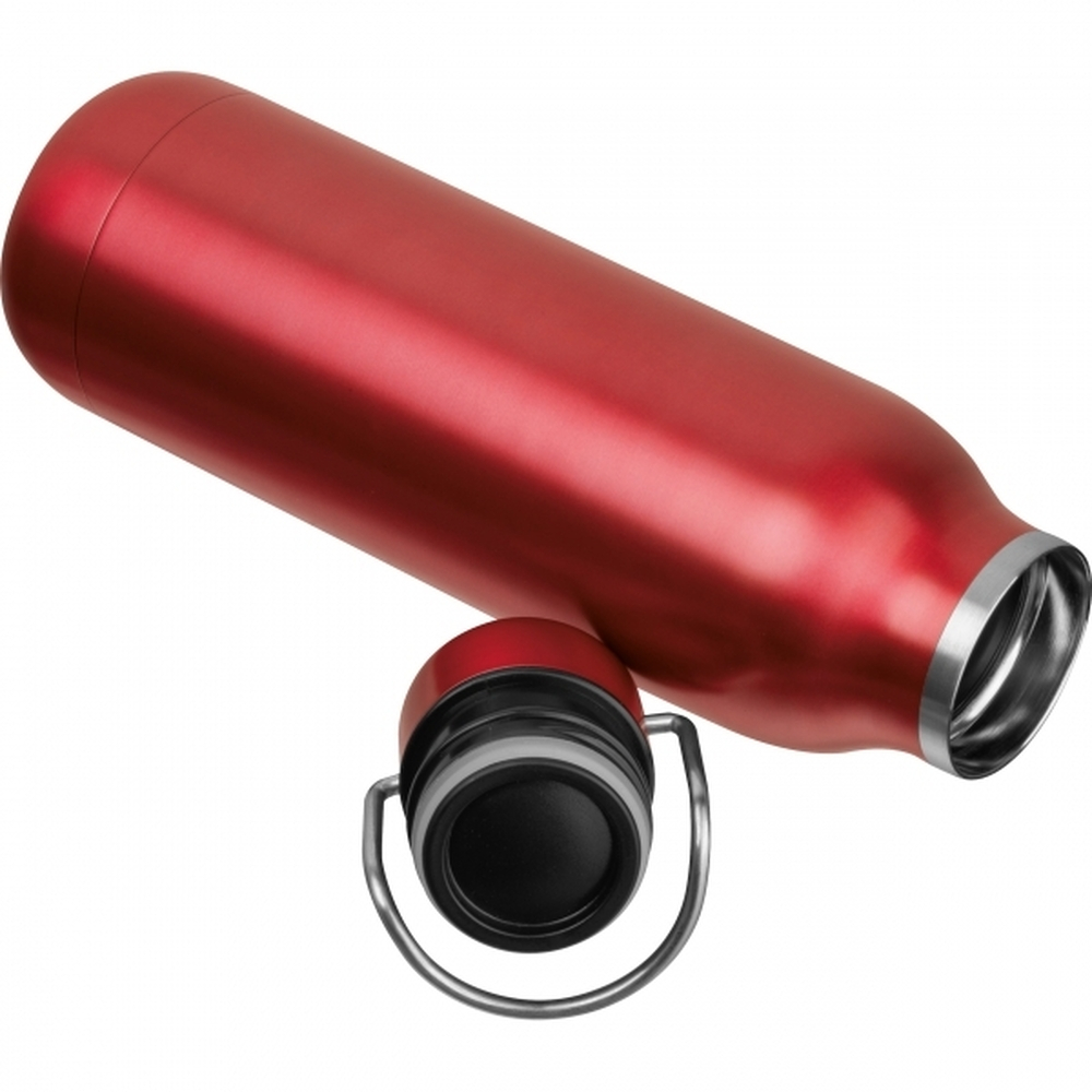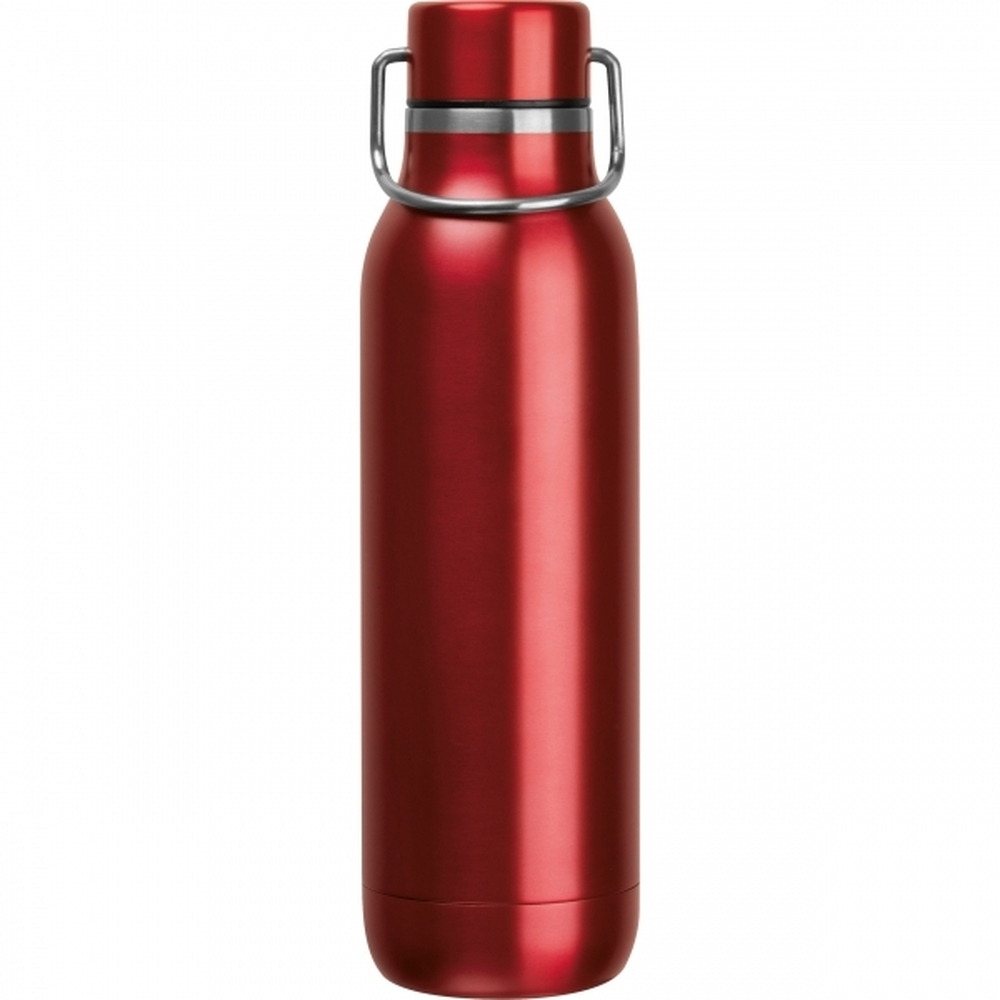 Butelka do picia ze stali nierdzewnej z podwójnymi ściankami z uchwytem do noszenia na pokrywce i pojemnością 600 ml.