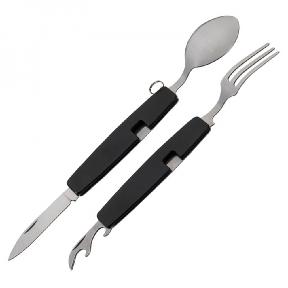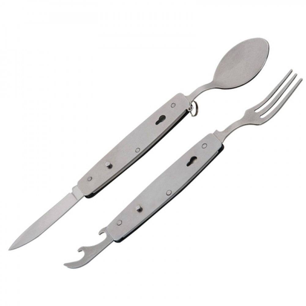 Sztućce kempingowe wykonane ze stali nierdzewnej, cztery rozkładane elementy: łyżka, widelec, nożyk i otwieracz do butelek.