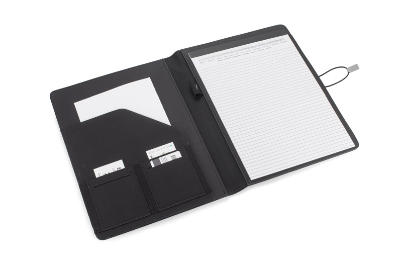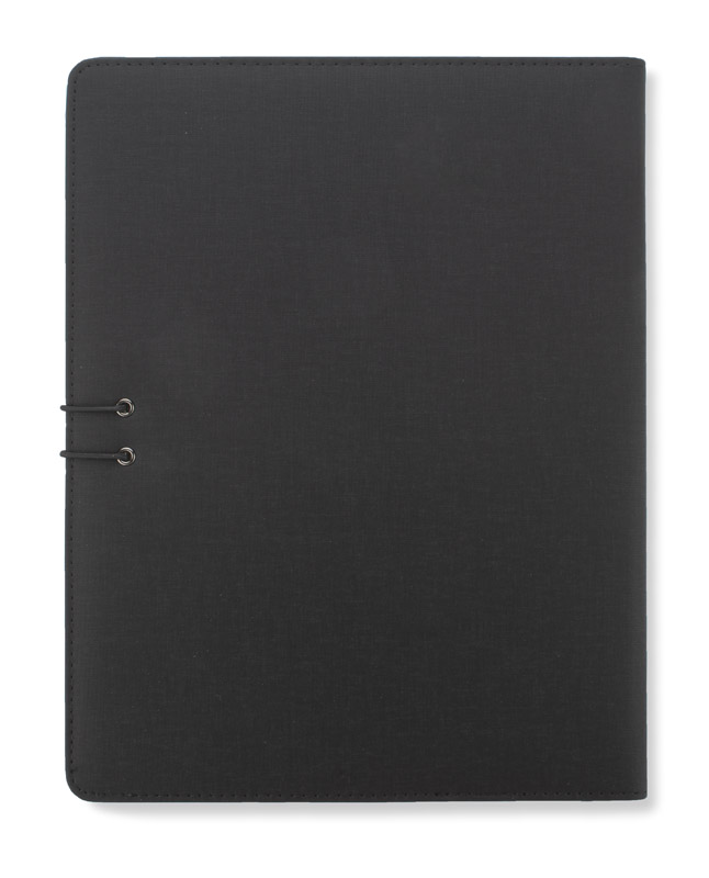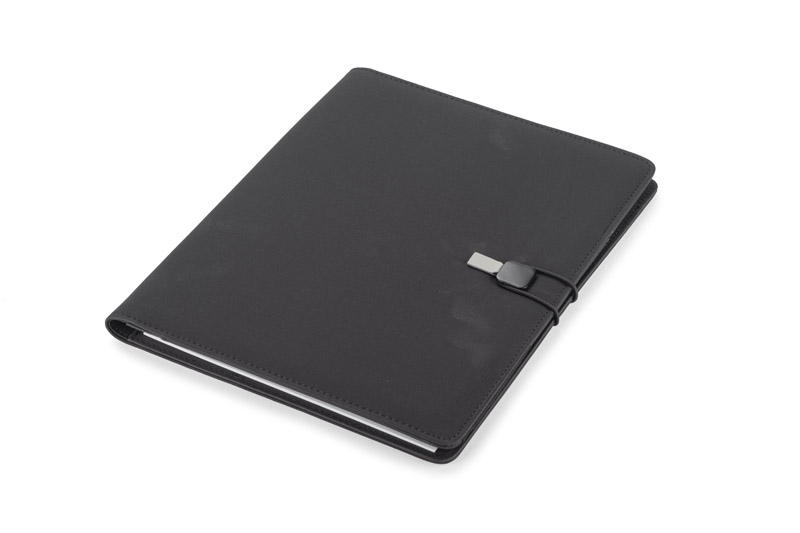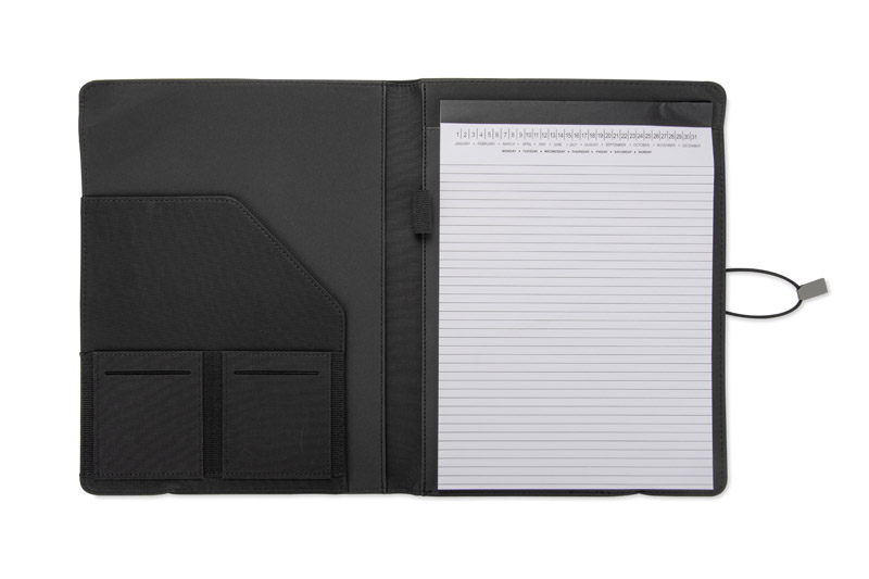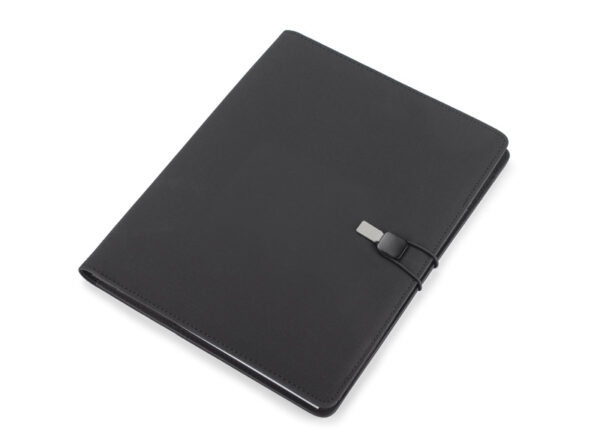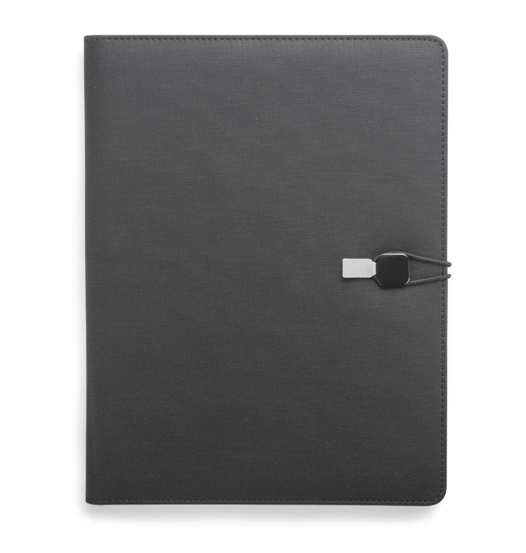 Teczka konferencyjna TELLA zamykana na gumkę zakończonąmateriałem skóropodobnym (PU) w kolorze szarym, która ułatwia otwieranie teczki i jednocześnie stanowi ciekawą i elegancka ozdobę .