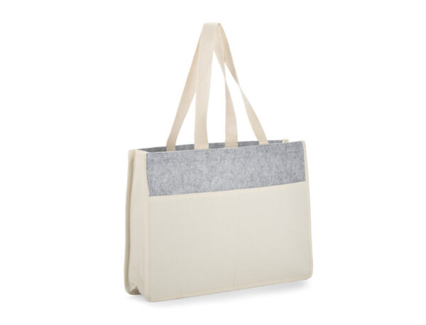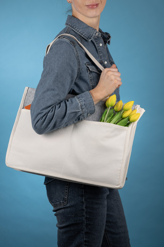 Torba bawełniana PAJ o gramaturze 320 g łączy dwa materiały – przód i tył wykonano z filcu, natomiast spód, boki, uchwyty oraz dwie przednie kieszenie z bawełny.