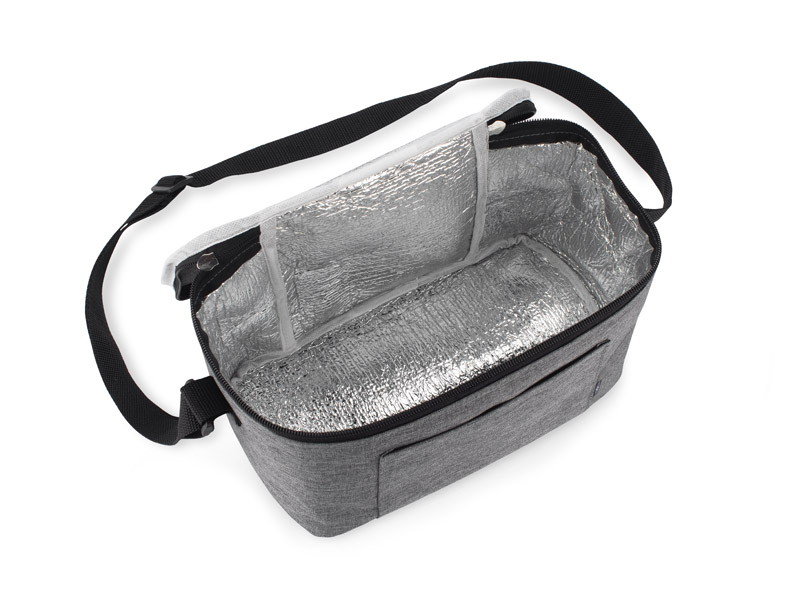 Torba termiczna CHILLER z izolacją aluminiową. Wykonana z recyklingowanego materiału rPET. Zamykana na zamek błyskawiczny. Posiada regulowany pasek ułatwiający przenoszenie torby oraz małą kieszonkę na drobiazgi.