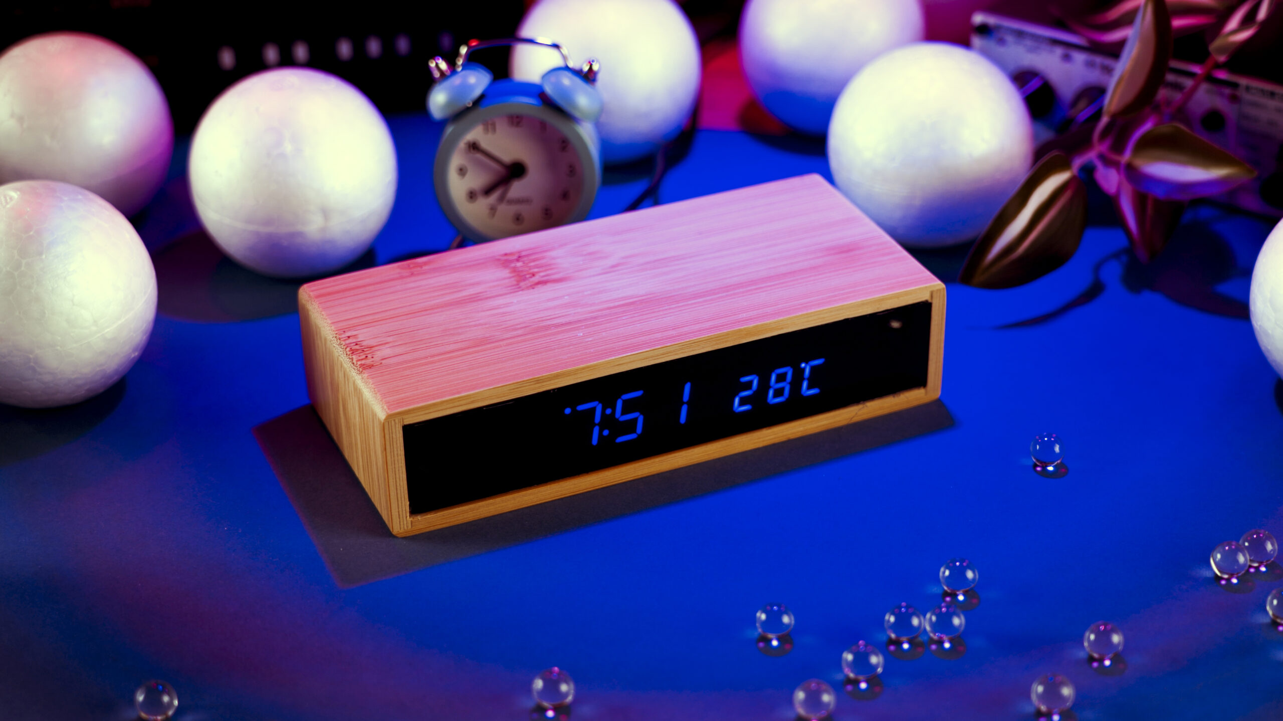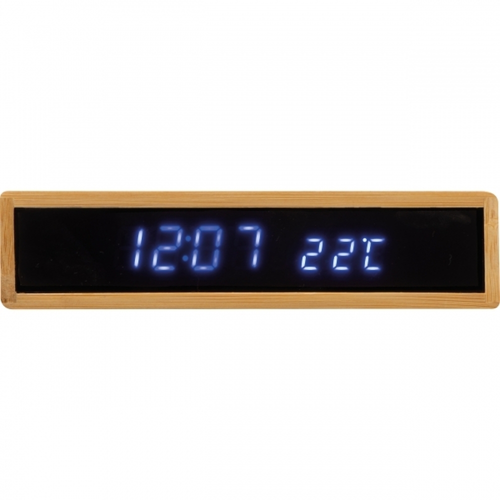Zegar na biurko, wykonany z bambusa z cyfrowym wyświetlaczem LED pokazującym godzinę oraz temperaturę.