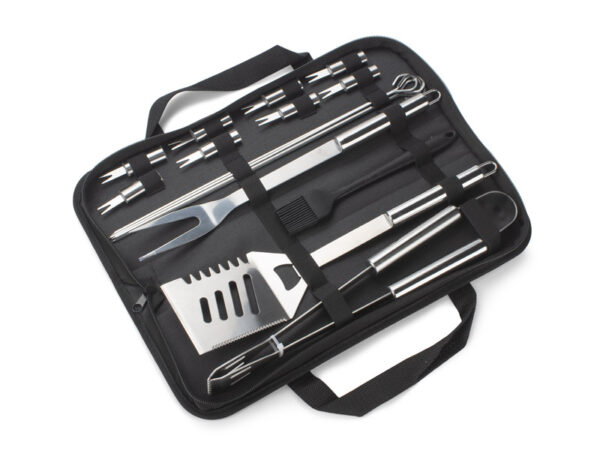 Zestaw do grilla ROLAN w poliestrowym etui zawiera 16 elementów ze stalowymi rączkamii: 4 szpikulce do szaszłyków, szczypce, łopatkę z otwieraczem do butelek, widelec, 8 uchwytów do kolb kukurydzy oraz silikonowy pędzelek.