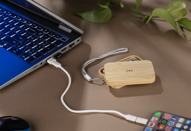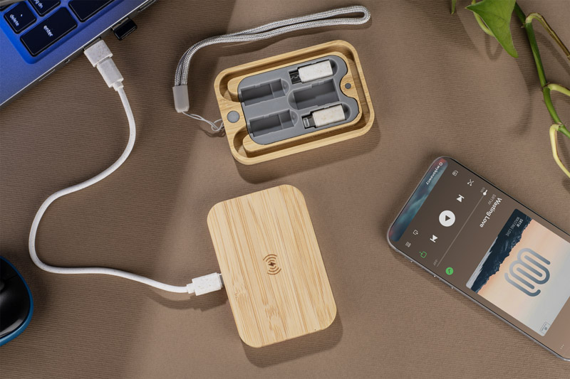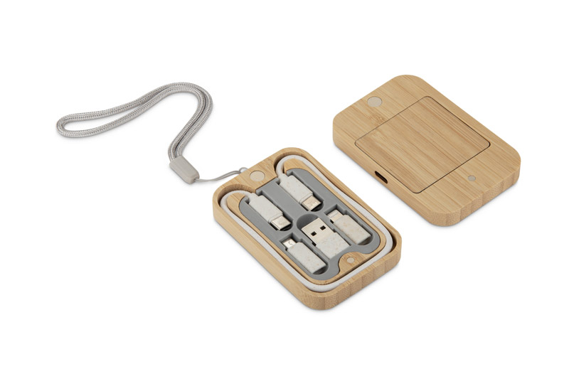 Zestaw kabli BUMO to praktyczne i wielofunkcyjne akcesorium do ładowania, umieszczone w estetycznym etui z bambusa.