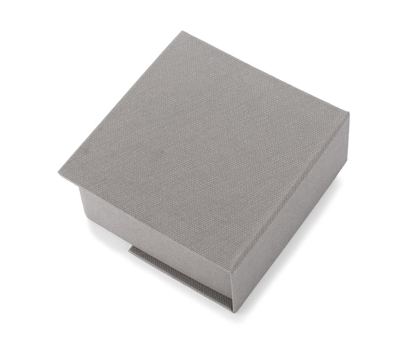 Praktyczna kostka z zestawem karteczek na biurko wykonana z szarego papieru o teksturze drobnej kratki. Kostka zawiera 300 luźnych kartek na notatki. Na wewnętrznej stronie wieczka przyklejone karteczki memo w pięciu kolorach.