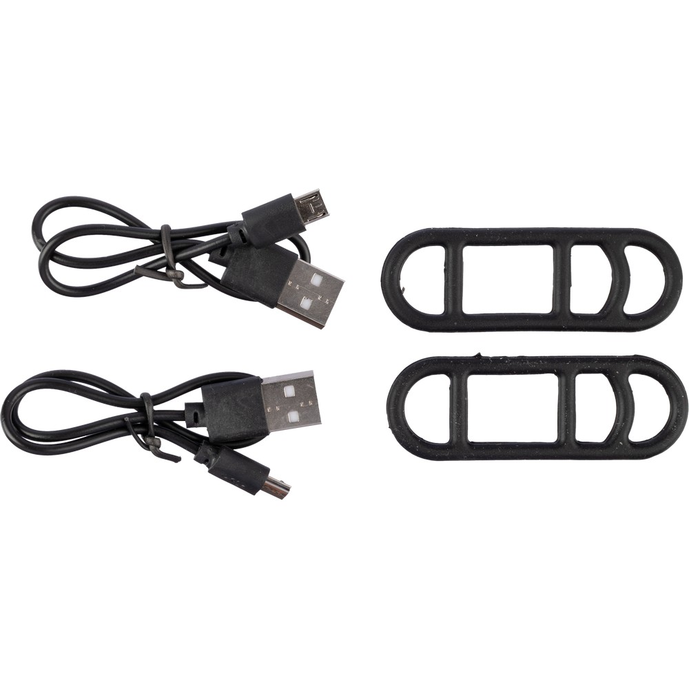 Zestaw 2 lampek rowerowych, posiadają 3 diody LED oraz 4 tryby świecenia i baterię o pojemności 650 mAh, sprawdzi się na wycieczkach rowerowych, produkt wykonany z ABS